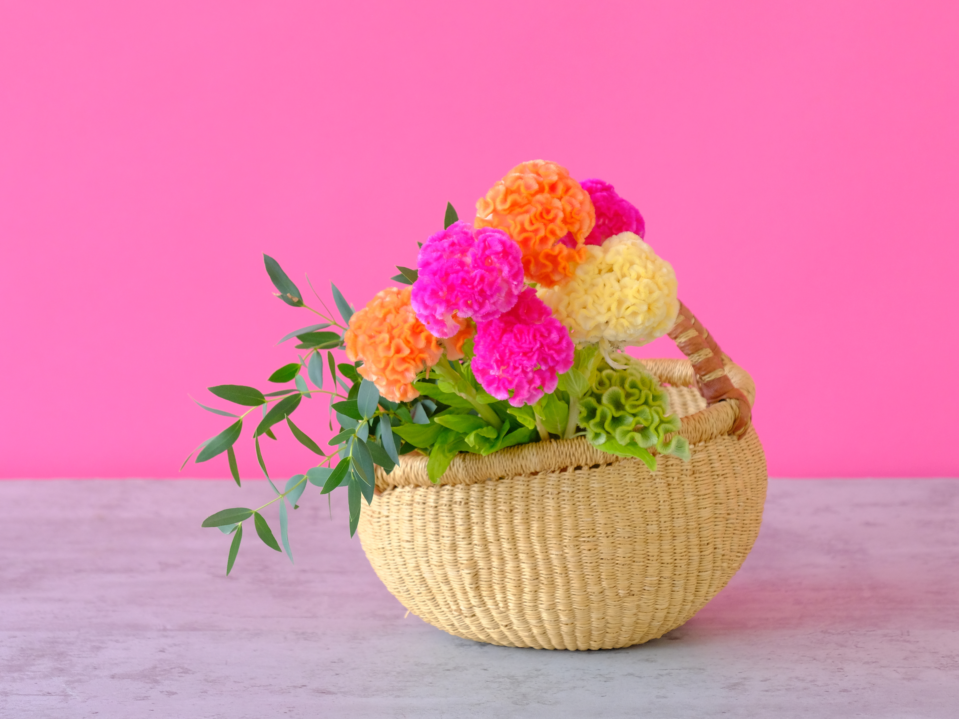 コップなどに入れたケイトウとグリーンをバスケットに入れるだけで、まるでアレンジメントのような花あしらいの出来上がり。