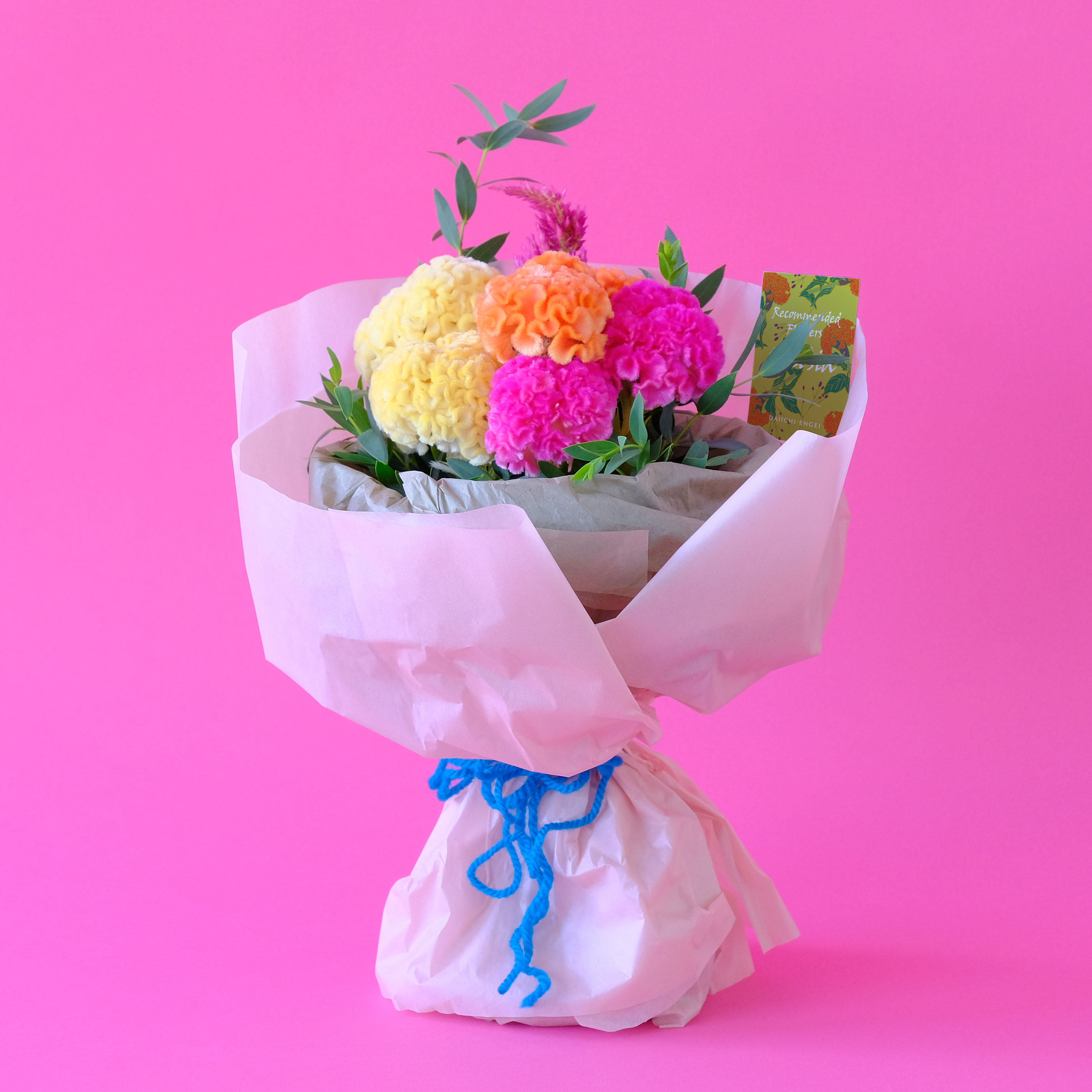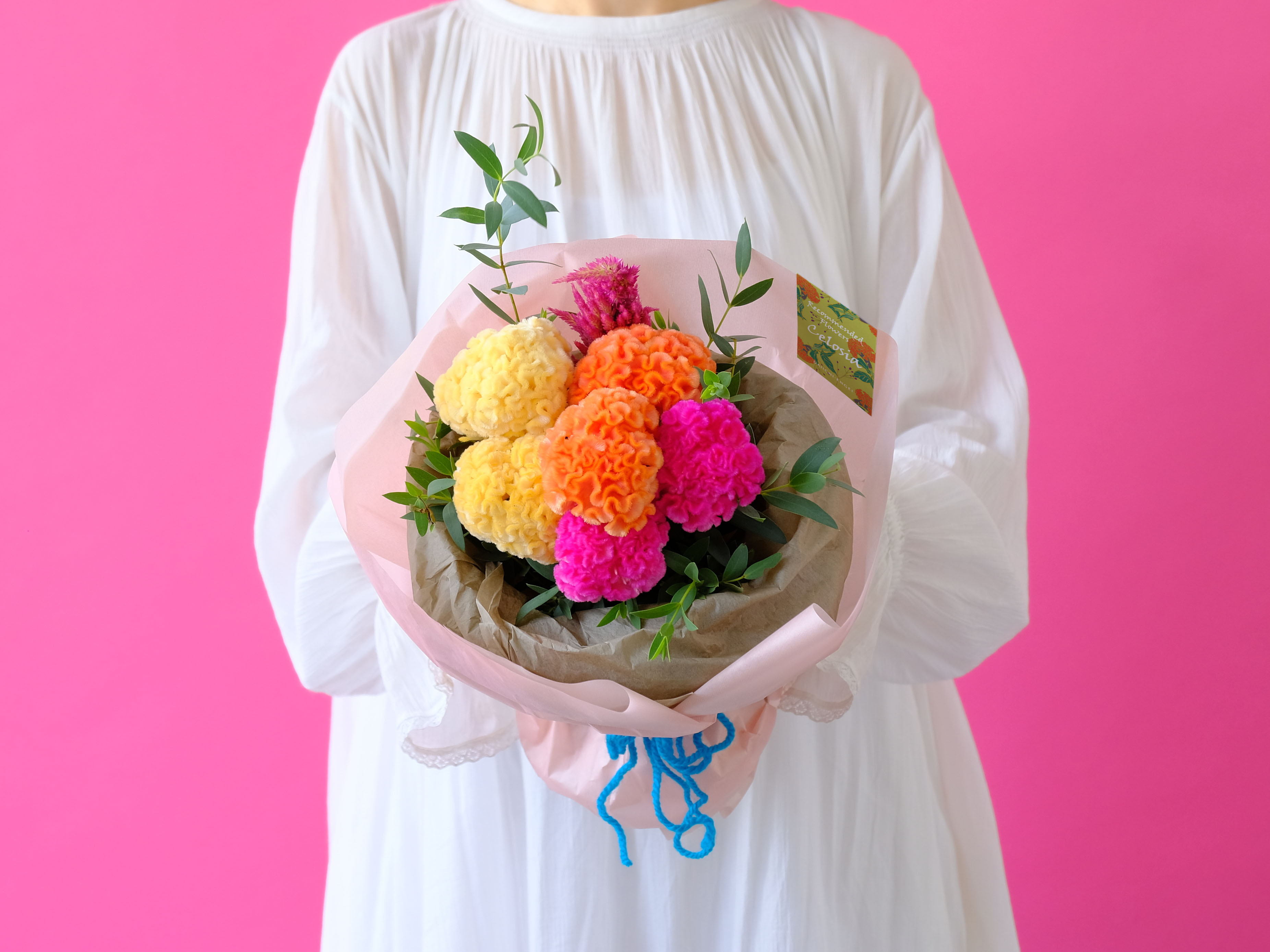 ショップおすすめのケイトウを程よいボリュームのブーケに仕上げました。敬老の日など季節の贈り物にもおすすめです。