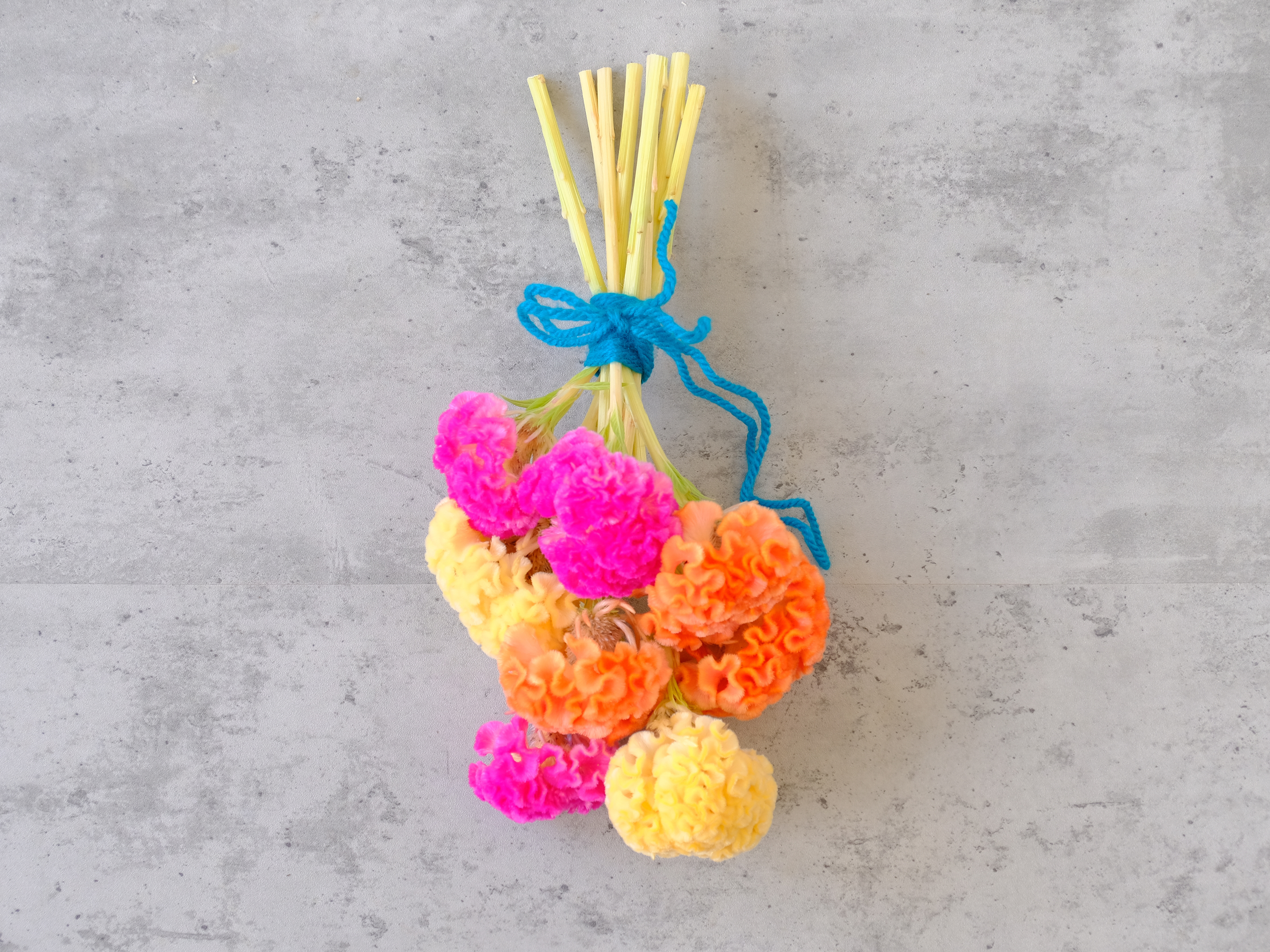 直射日光に当たらない風通しの良い場所に、逆さにしてぶら下げておくと、一週間ほどで色鮮やかなケイトウのドライフラワーができあがります。フレッシュな時とは違う渋めの色合いや風合いの差を楽しんでくださいね。