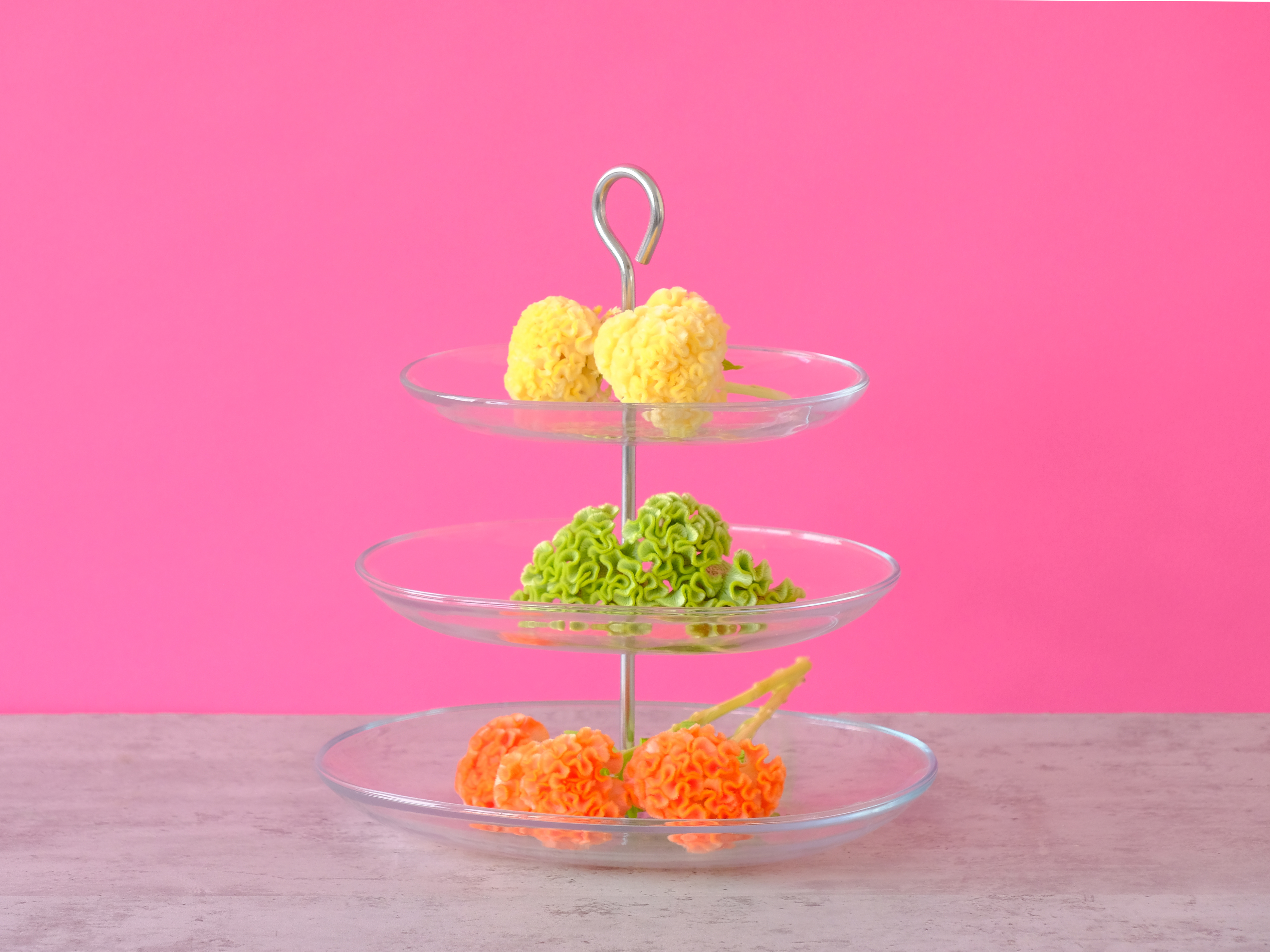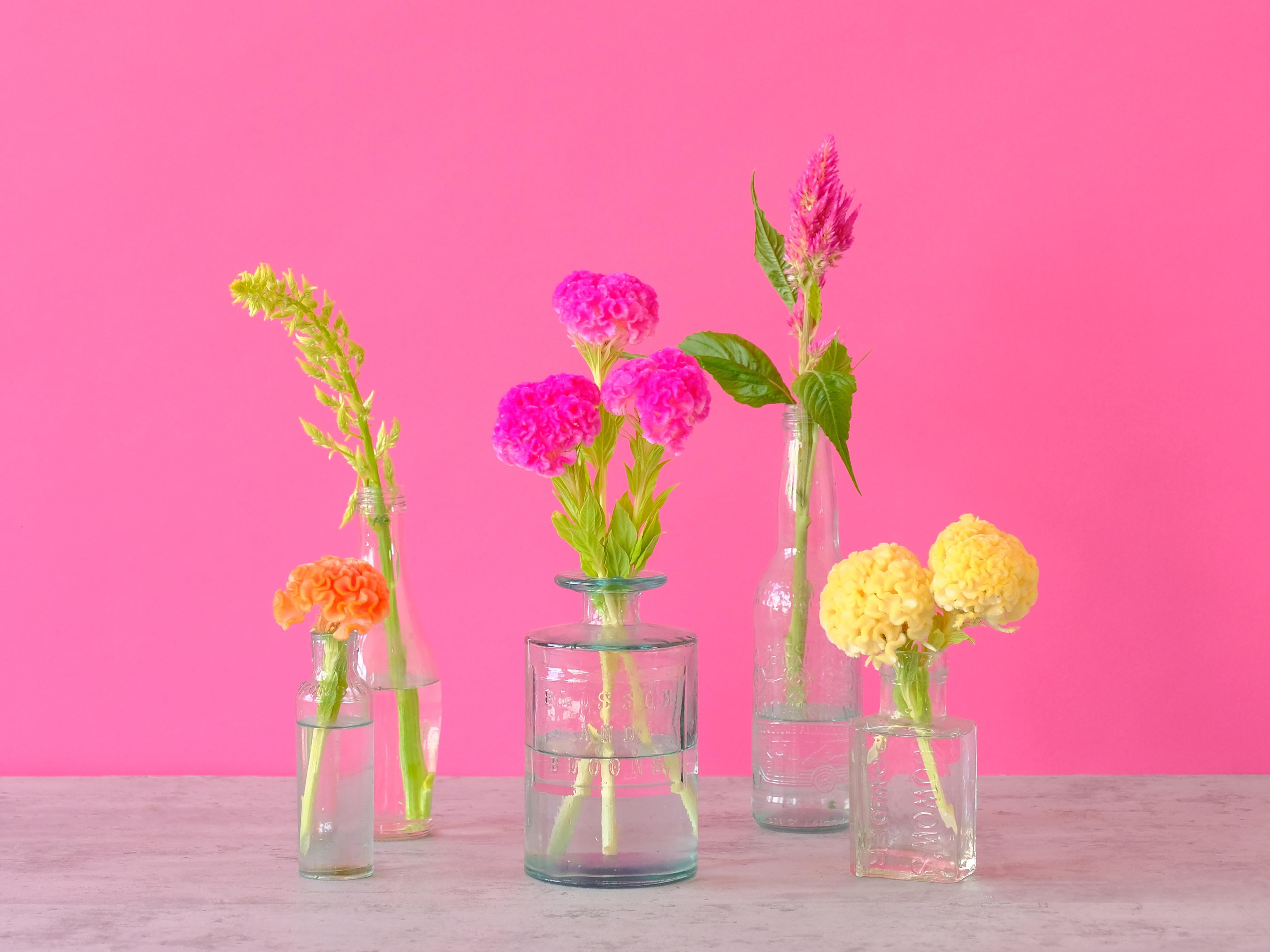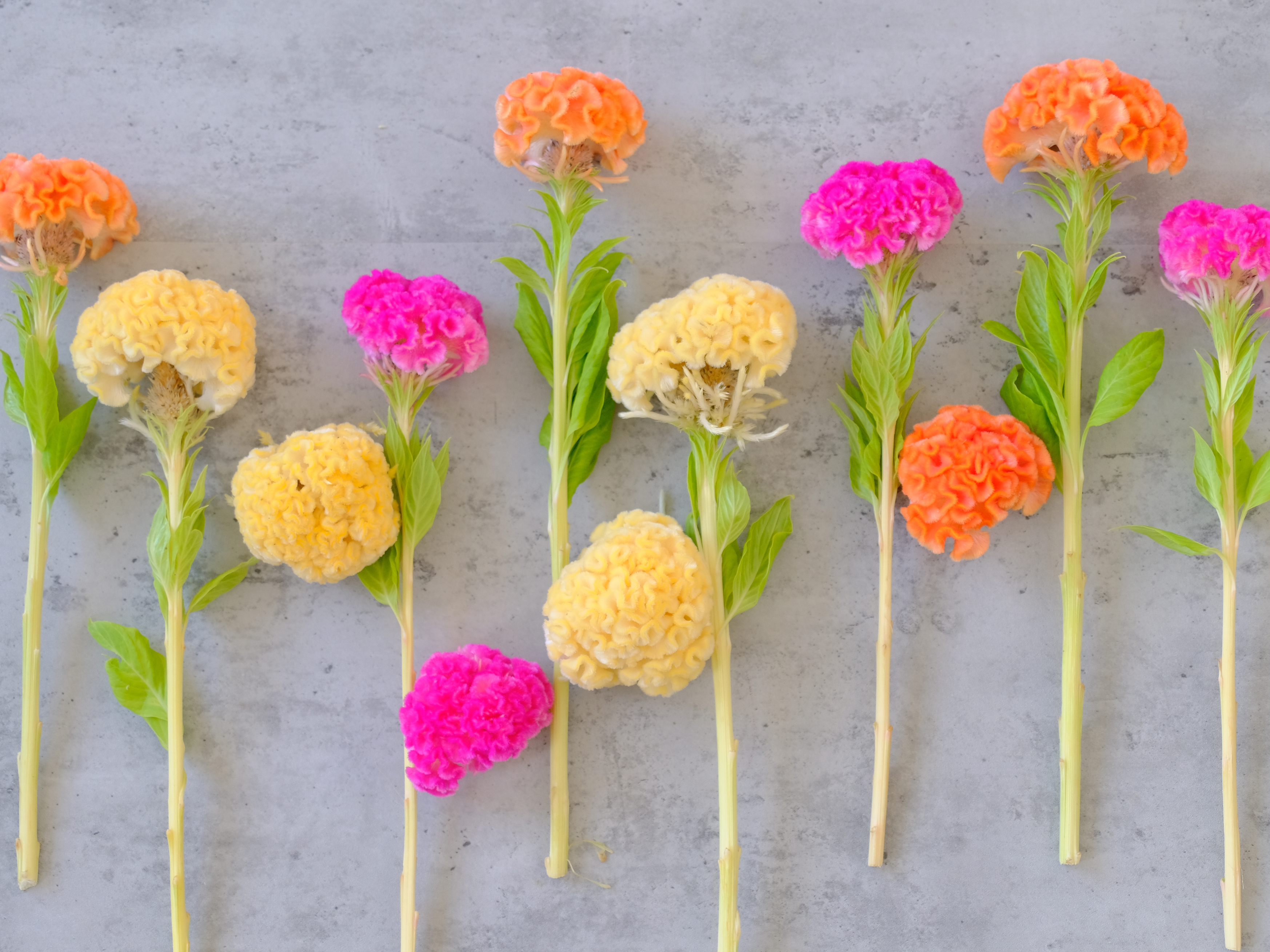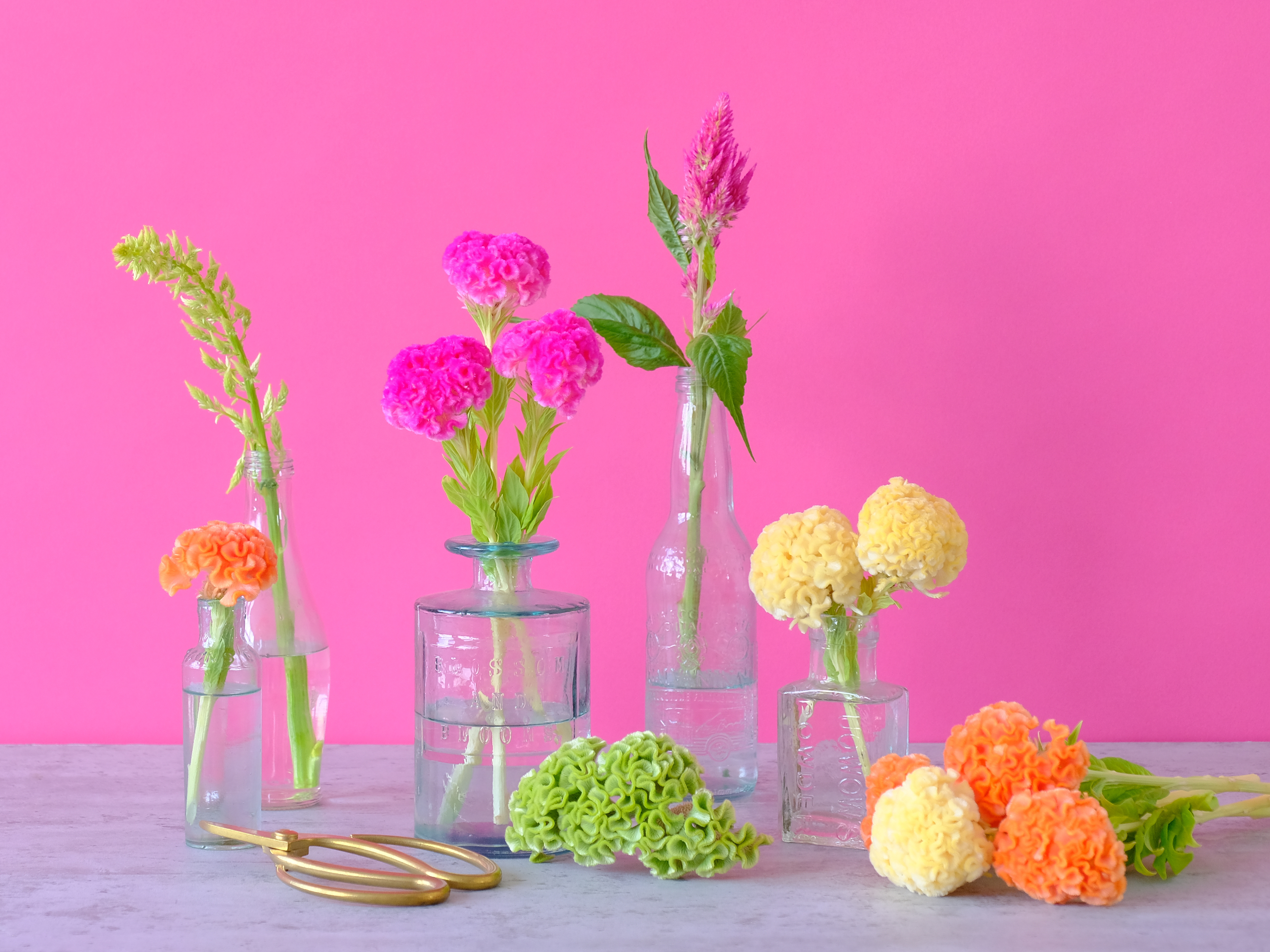 ケイトウは丈夫なので数時間は水につけなくても大丈夫。置くだけの簡単なデコレーションでパーティーシーンを彩りましょう。(葉はしおれやすいのであらかじめ除いておきます。終わったら茎の下をカットして水にいけて楽しみましょう。)
