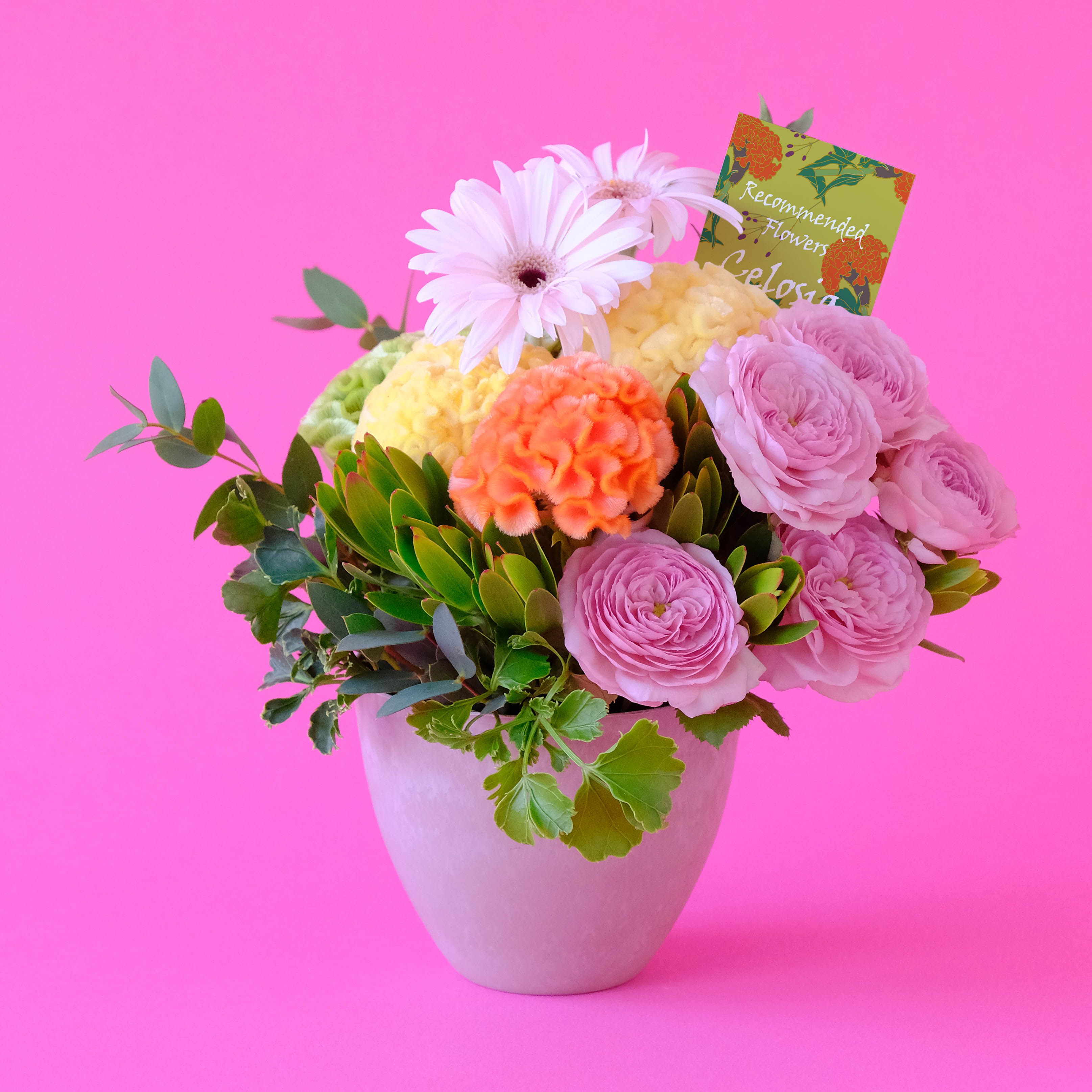 ショップおすすめのケイトウを器にいけた秋らしいアレンジメント。器付きでそのまま飾って楽しめます。