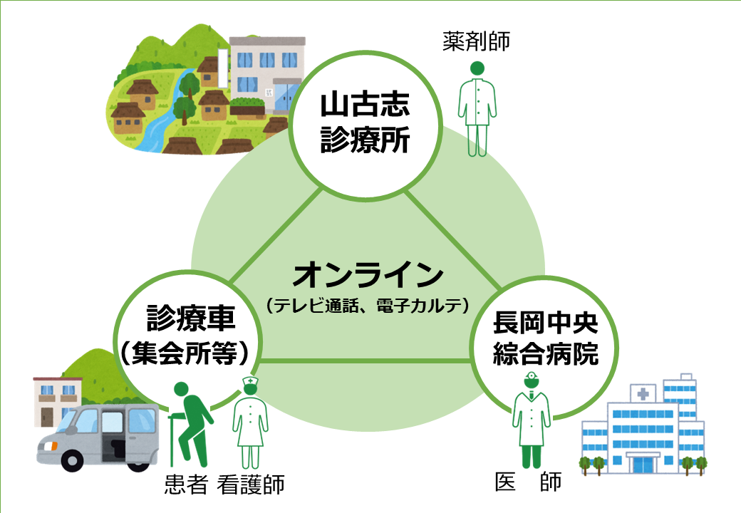 長岡市は令和5年1月より、病院から医師を定期派遣し診療を再開すると同時に、オンライン診療を前提とした移動型診療車を導入。車両には、富士フイルムビジネスイノベーションジャパンが導入支援したテレビ会議システム「LoopGate」を搭載し、画面越しでも顔色・患部・薬の確認が可能な遠隔診療環境を構築しました。