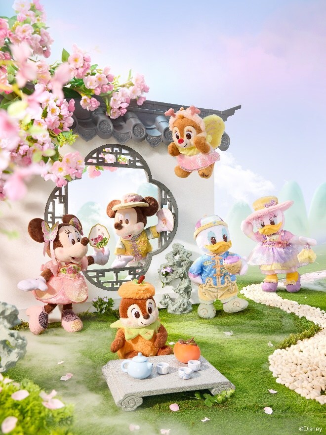 ダッフィーと仲間たちの新衣装には、それぞれの花をモチーフにした繊細な刺繍や装飾が施されています。ダッフィーはツバキの刺繍が美しい中華風ジャケット、シェリーメイはバラをあしらった可愛らしい帽子、ジェラトーニは四季蘭をイメージした刺繍の上着、オル・メルは金色のラインが映えるムクゲ刺繍のトップスを着用。ステラ・ルーのヘアアクセサリーはスズランの花、クッキー・アンのアクセサリーはハスのモチーフがあしらわれています。リーナ・ベルのジャケットとヘッドドレスには、細やかなキンモクセイの模様が散りばめられ、ミッキーとミニーも、モミジハゼ(木芙蓉)の模様が入ったエレガントな中華風衣装で花のパーティーに参加します。