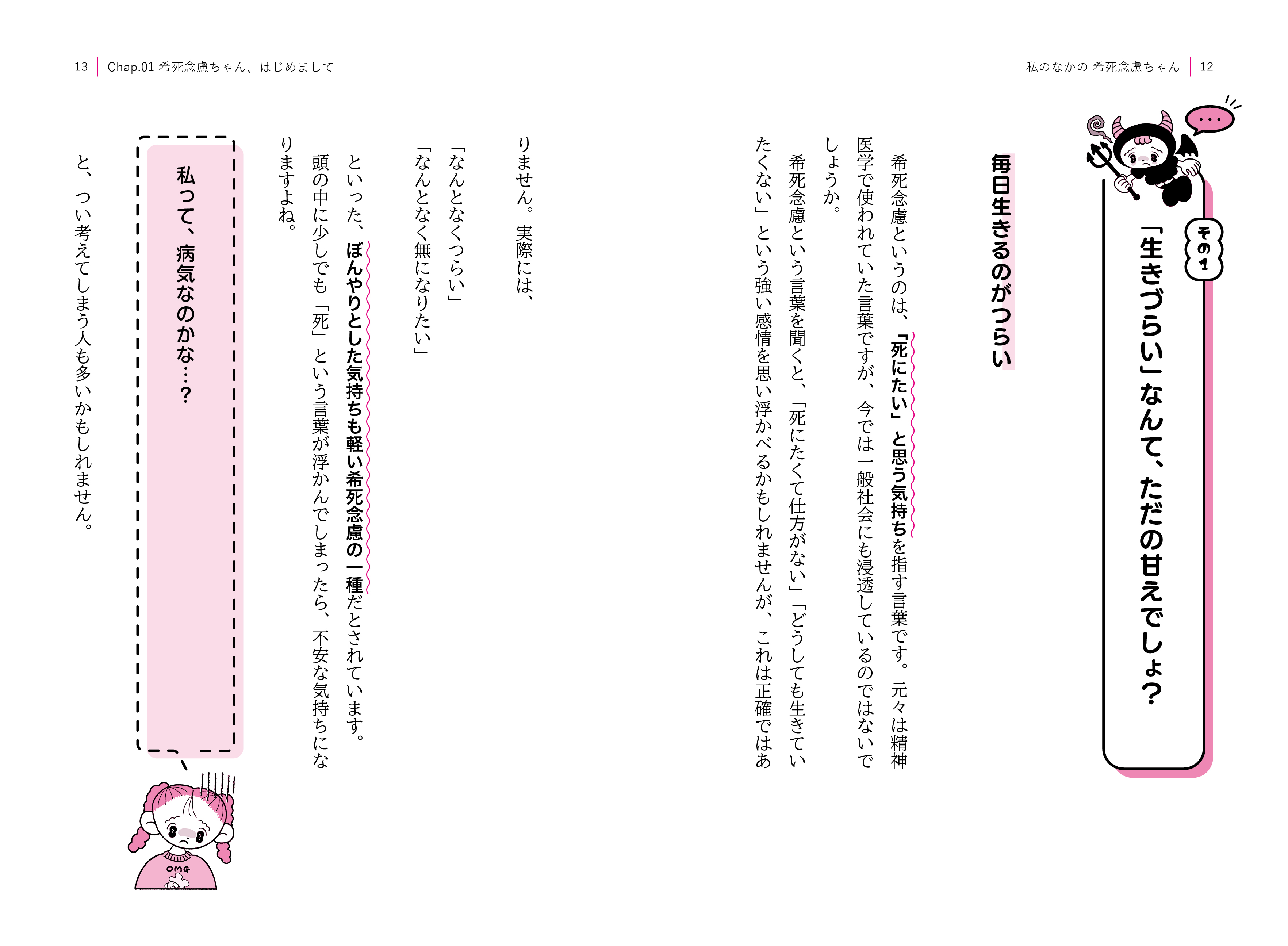 本書は、キャラクターとして具現化した「希死念慮ちゃん」との対話を通して、あなたの心の現在地を把握し、強くしなやかに生きるための手助けになることを目指して書かれました。