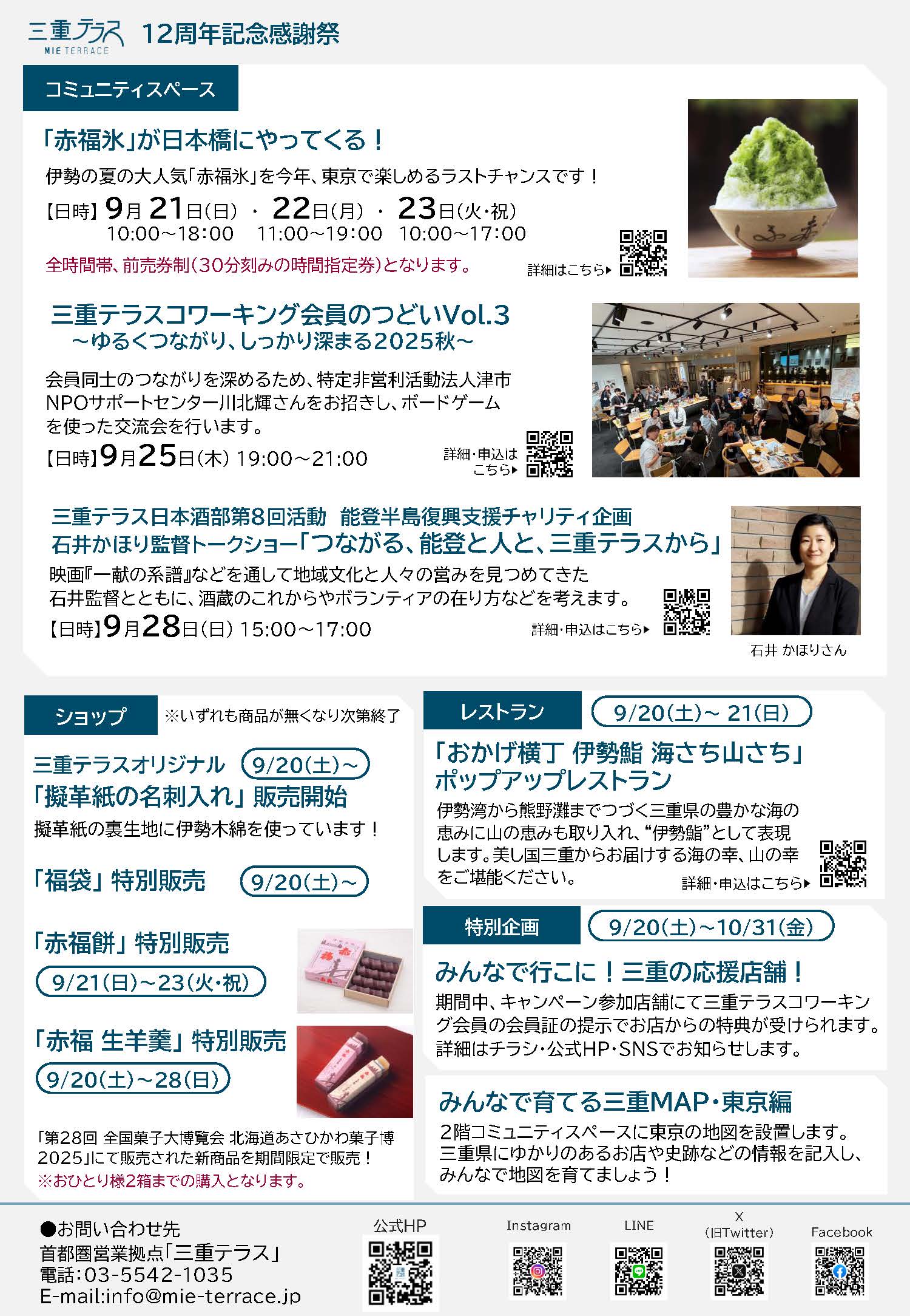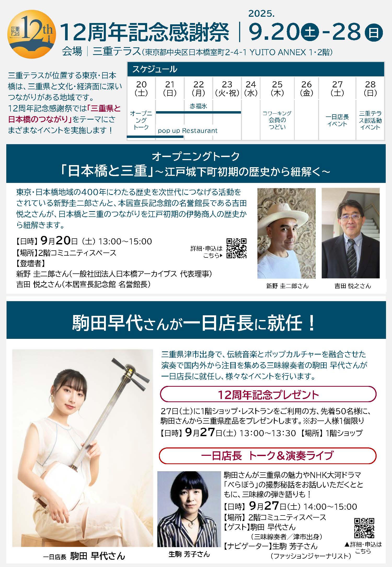 三重の魅力を情報発信している首都圏営業拠点「三重テラス」は、9月にオープン12周年を迎えます。三重テラスが位置する東京・日本橋は、多くの伊勢商人が日本橋で成功をおさめ、今もなお老舗企業として軒を連ねるなど、日本橋と三重県は文化・経済面で深いつながりがあります。 今年は12周年を記念して、「三重県と日本橋のつながり」をテーマにさまざまなイベントを実施します。
