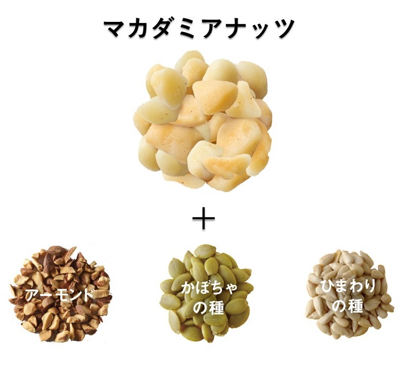 マカダミアナッツが新たに加わり、香ばしさ・彩り・食感がアップ。アーモンド・かぼちゃの種・ひまわりの種と合わせ、ザクザク感とナッツのコクがクセになる、見た目も食感も楽しい万能トッピングです。