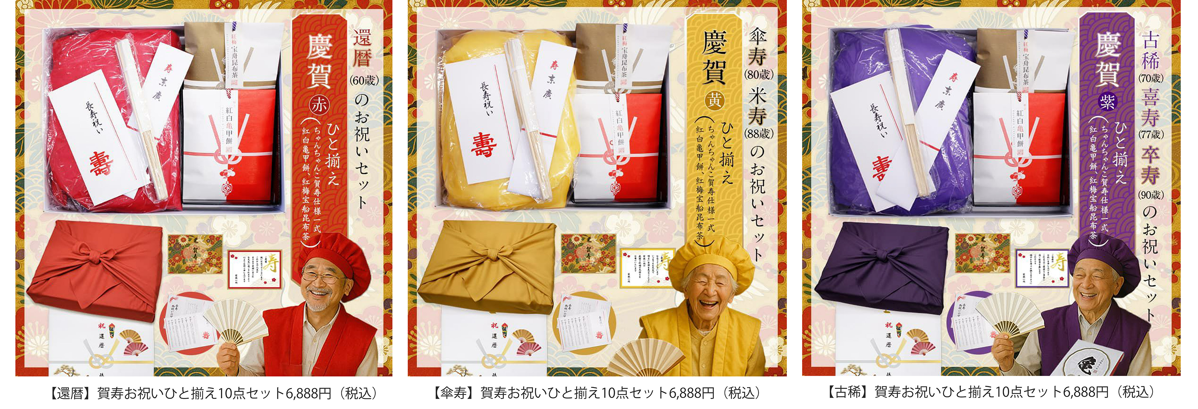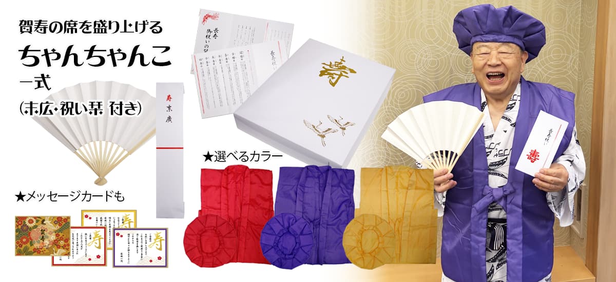 祝い年齢に合わせた「赤」「紫」「黄」のちゃんちゃんこに、大黒頭巾・末広・賀寿の栞・寿箱・オリジナルメッセージカード・のし紙・賀寿ふろしきを加えた豪華ひと揃えをセットに。