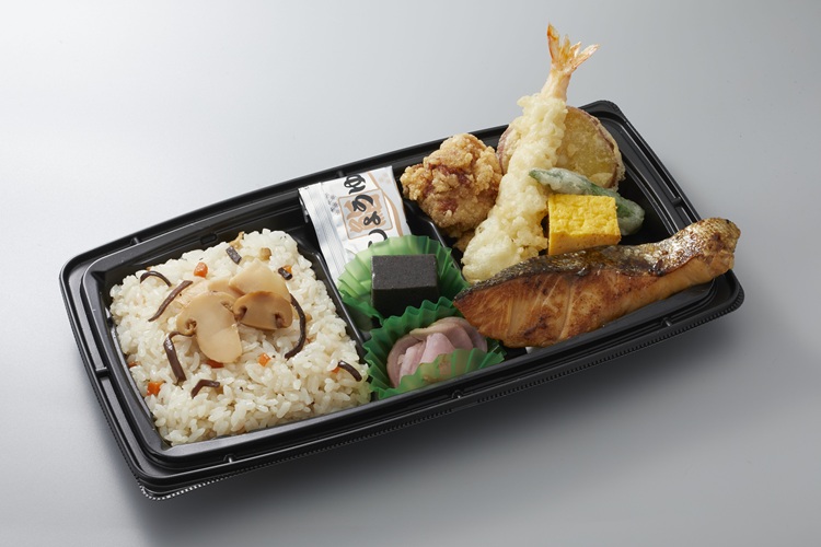 旬の松茸ご飯と、焼き魚や海老天、若鶏の唐揚げなどの定番おかずを詰め合わせた秋の行楽にぴったりなお弁当です。