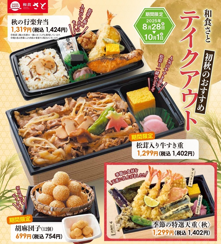 国内199店舗を展開する「和食さと」では、8月28日(木)からの期間限定で秋の味覚たっぷりなテイクアウト商品を販売します。今回販売する商品は、秋の味覚の王様「松茸」入りの牛すき重や、秋の風物詩「秋刀魚」や「さつまいも」、「黒舞茸」が入った季節の特選天重、お弁当定番のおかずに「松茸ご飯」を添えた「秋の行楽弁当」をご用意しております。さらにお月見シーズンにぴったり!?な胡麻団子を12個テイクアウトで販売! 満月をながめながら、秋の風情を味わえる一品です。