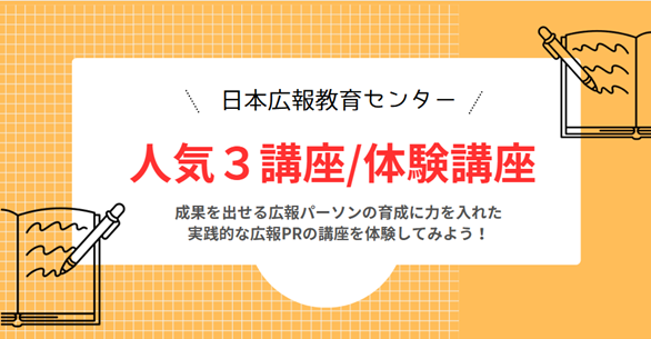 この「人気3講座/体験講座」は、日本広報教育センターが誇る実践的な講座内容から厳選した部分を抜粋し、広報の現場で即戦力として活躍できるスキルを学ぶことができる講座です。