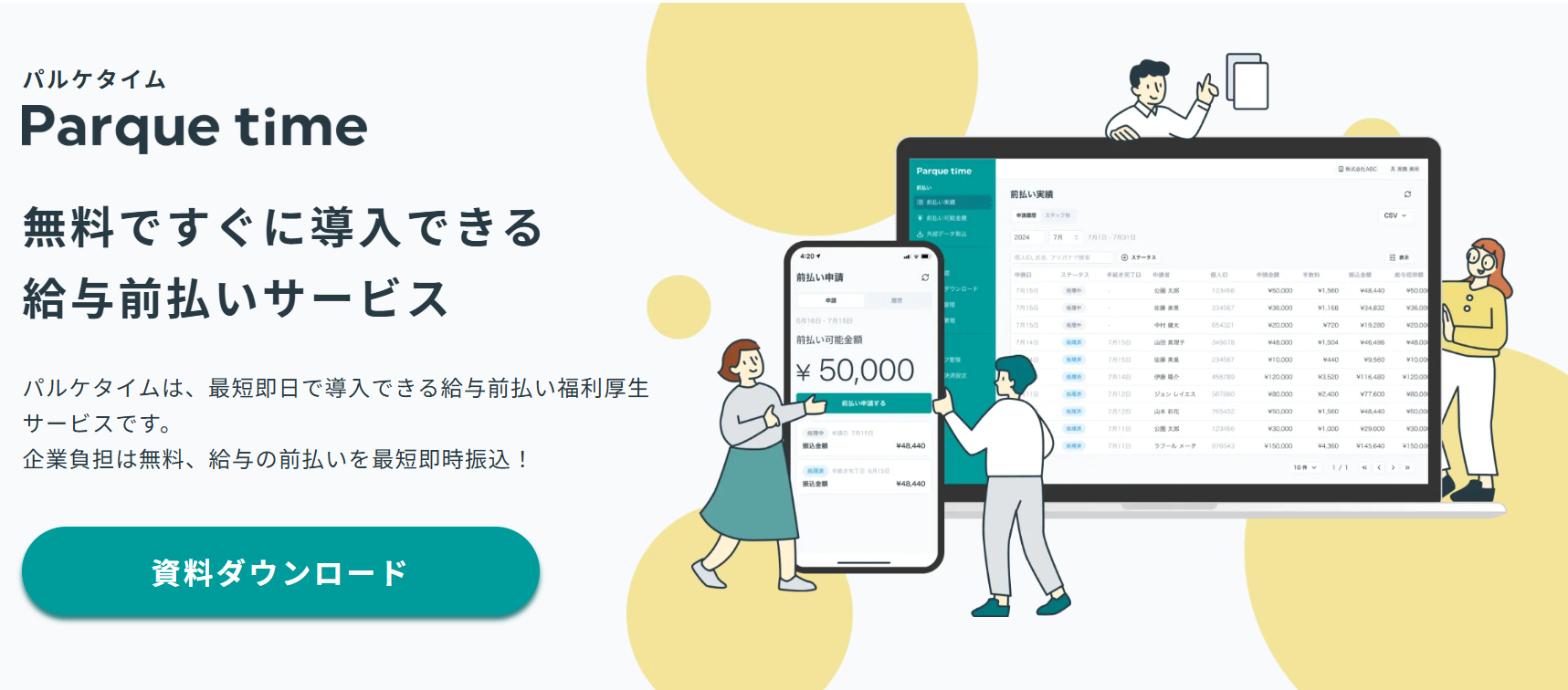 株式会社パルケタイムが提供する「パルケタイム」は、スタッフが働いた分の給与をスマートフォンやパソコンから好きなタイミングで受け取れる、給与前払い福利厚生サービスです。直感的でシンプルなUI設計により、ITに不慣れな方や高齢の方、外国籍の方でもスムーズに操作できます。
