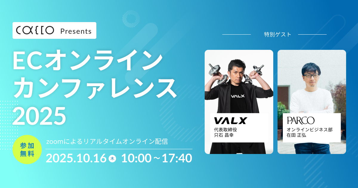 そこで開催する 「Cacco Presents ECオンラインカンファレンス2025」 では、5年で600万個超のプロテイン等を販売した「VALX」のマーケティング戦略、「オンラインパルコ」が実践する最新の不正利用対策、データ活用による収益拡大の最前線事例などをテーマに、業界を牽引するゲストが実践的な知見を共有します。