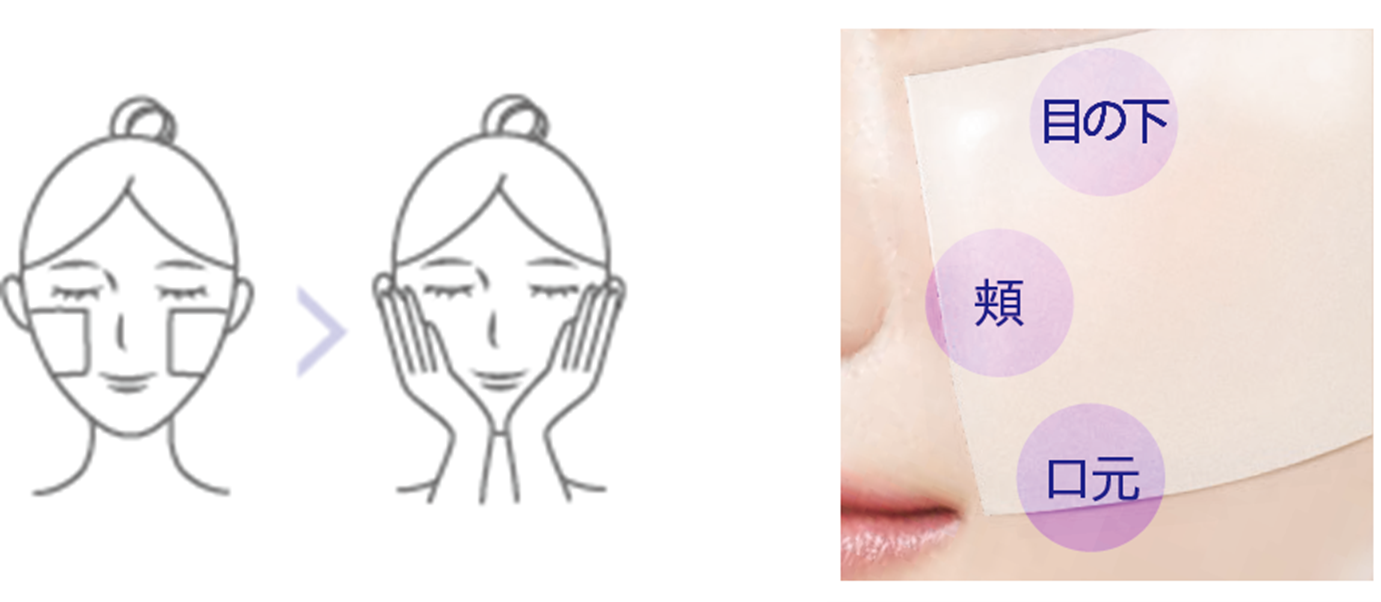 ③5分後にシートをはがし、肌に残った美容液を手のひらでなじませた後、美容液や乳液、クリーム等でしっかり保湿ケアを行ってください