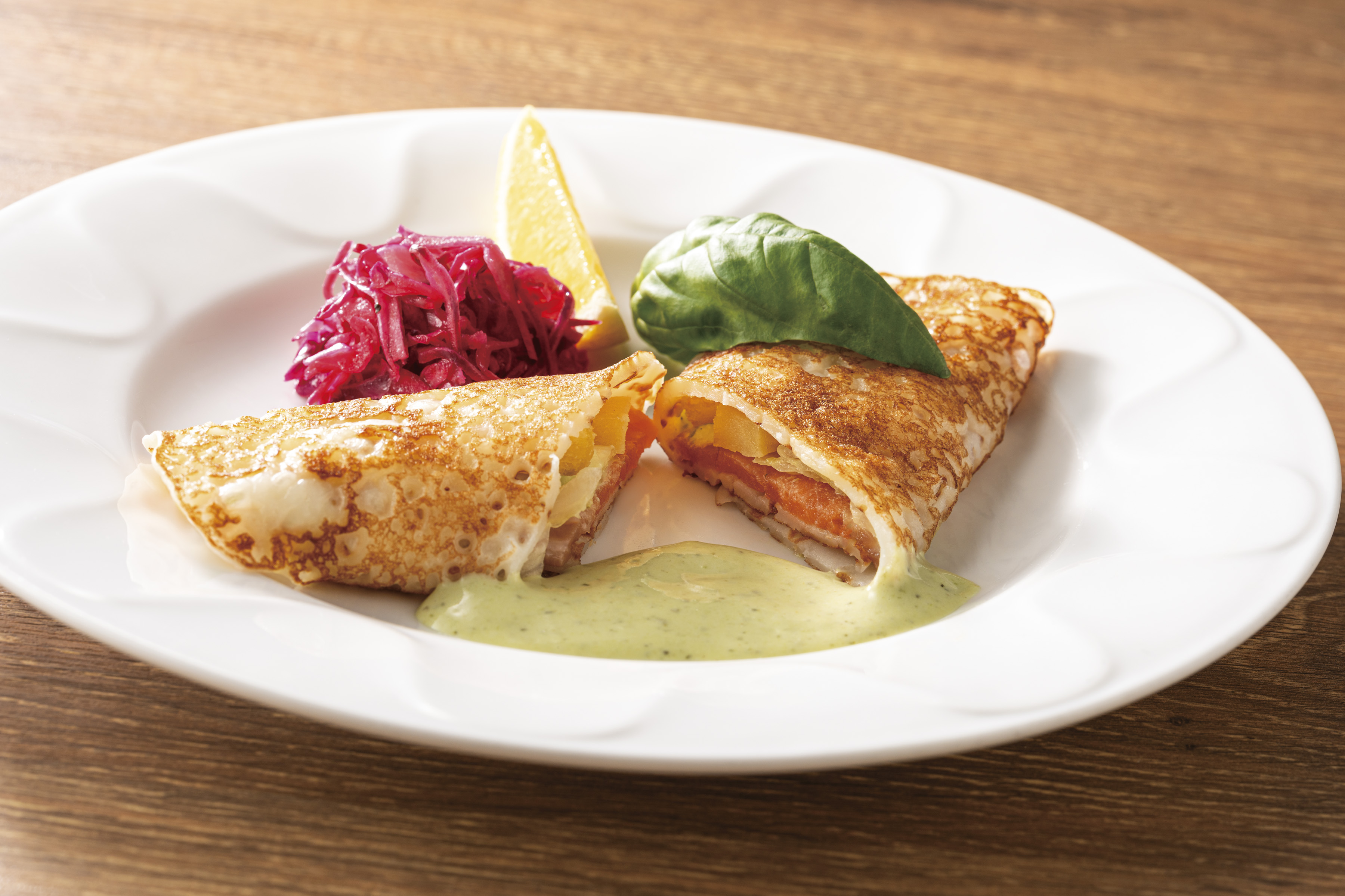 米粉を使用したもちもちのガレット生地にチーズを混ぜて、コクや風味を高めました。わさびがピリッと効いたバジルソースやレモンで爽やかにどうぞ。