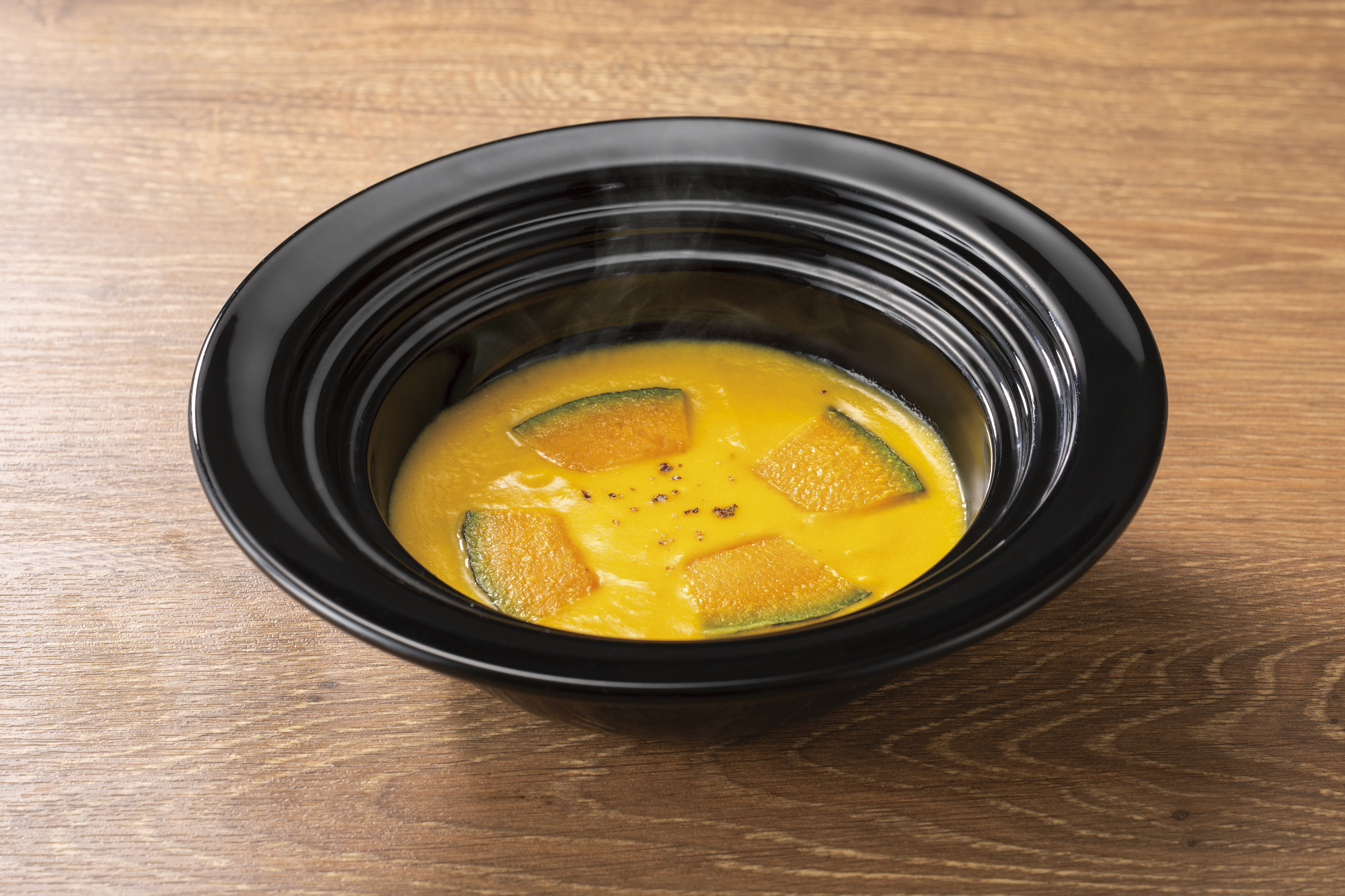 かぼちゃ本来のやさしい甘みを活かしたポタージュに、素揚げしたかぼちゃを添えて、秋らしい食感も楽しめるスープです。