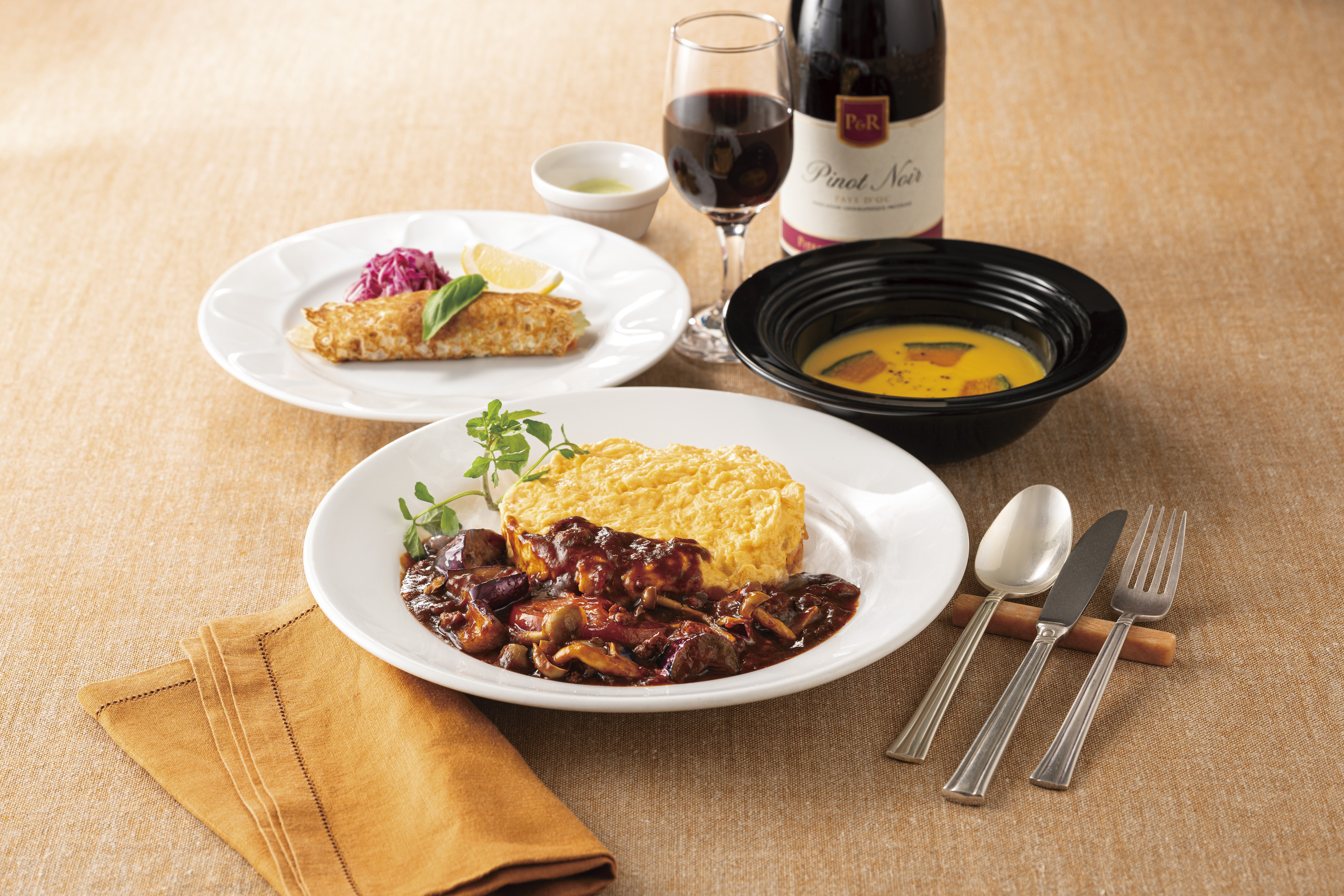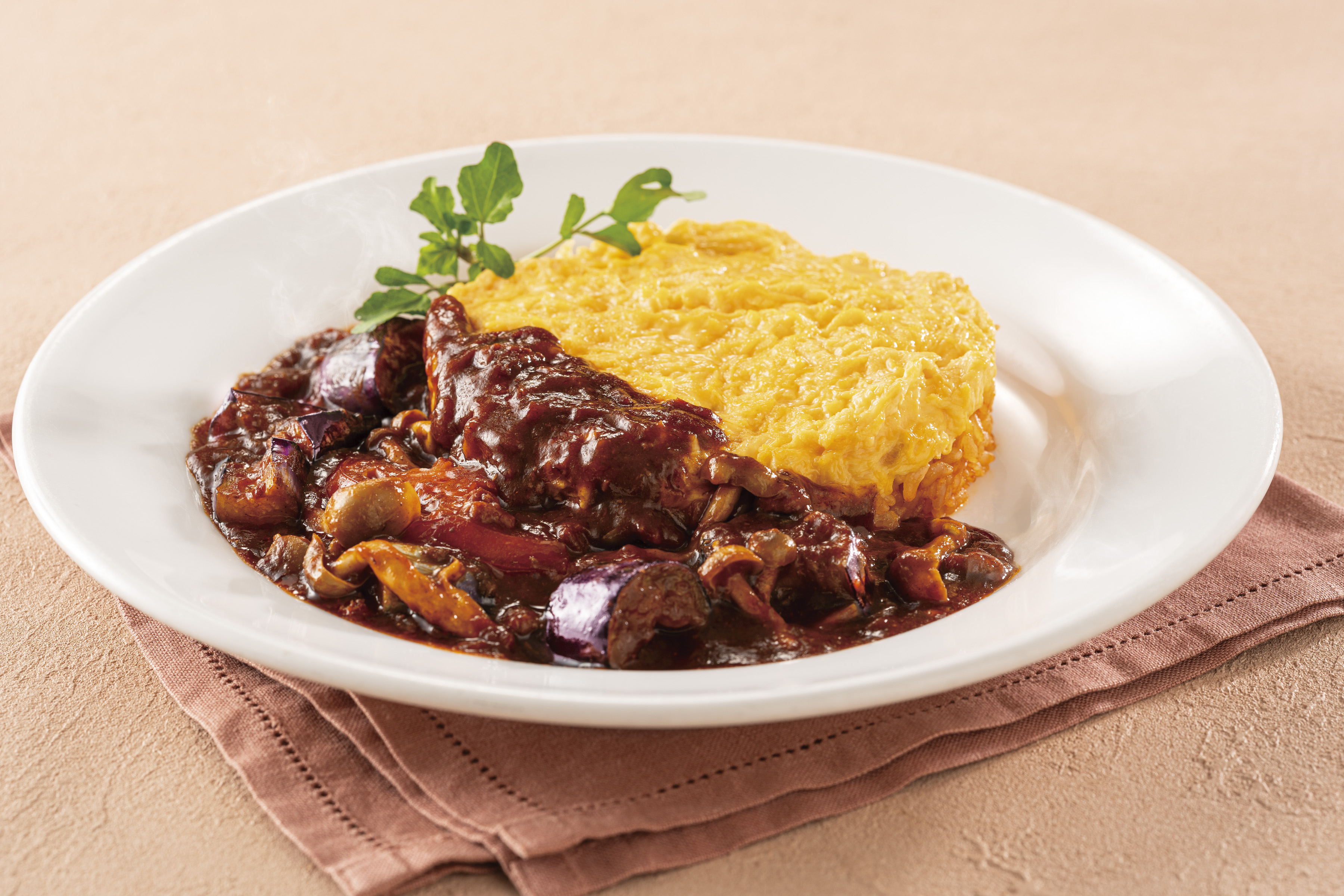 フランス語でケーキを意味する”ガトー”。ふわっとしたスクランブル状の卵で、ホールケーキのように仕立てたオムライスに、秋の野山をイメージしたデミミートソースを合わせました。