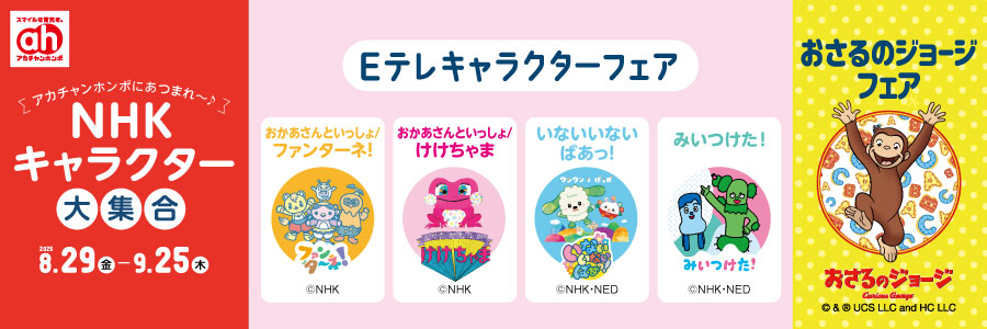 株式会社赤ちゃん本舗(本社:大阪市中央区 https://www.akachan.jp)は、2025年8月29日(金)から9月25日(木)まで「Eテレキャラクター」フェア・「おさるのジョージ」フェアを、全国のアカチャンホンポとオンラインショップ(https://shop.akachan.jp)で開催いたします。
