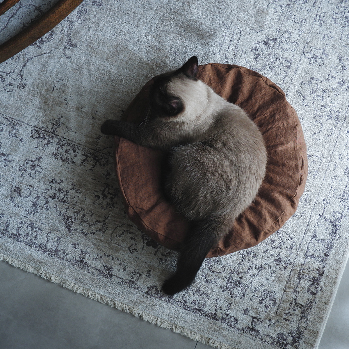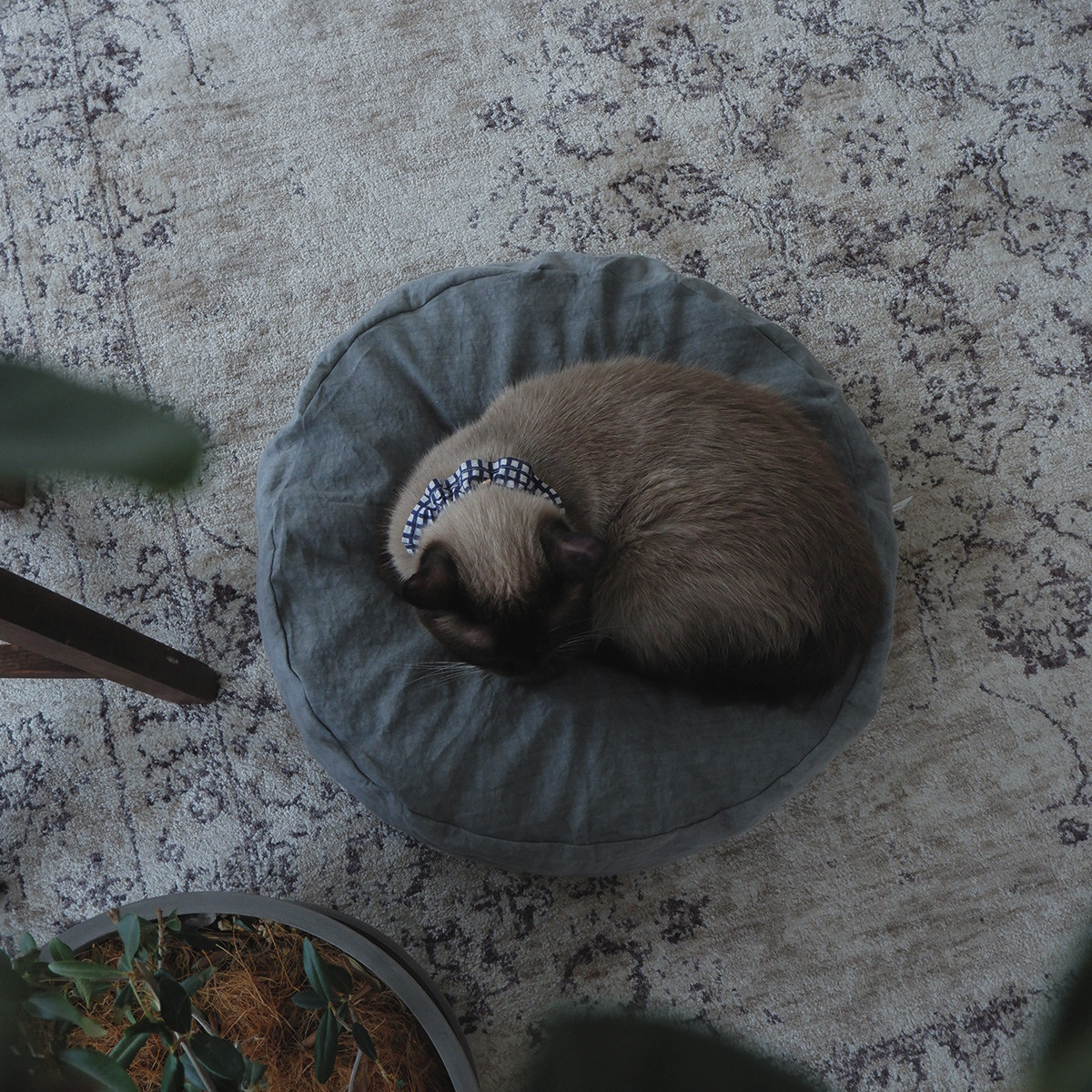「Pouf Cat Bed」は、丸まって眠る猫の姿勢にやさしくフィットするラウンド型のクッションベッド。専用フィリングの上から、取り外し可能なカバーを装着する2重構造で、季節やインテリアに合わせてカバーの着せ替えが可能です。