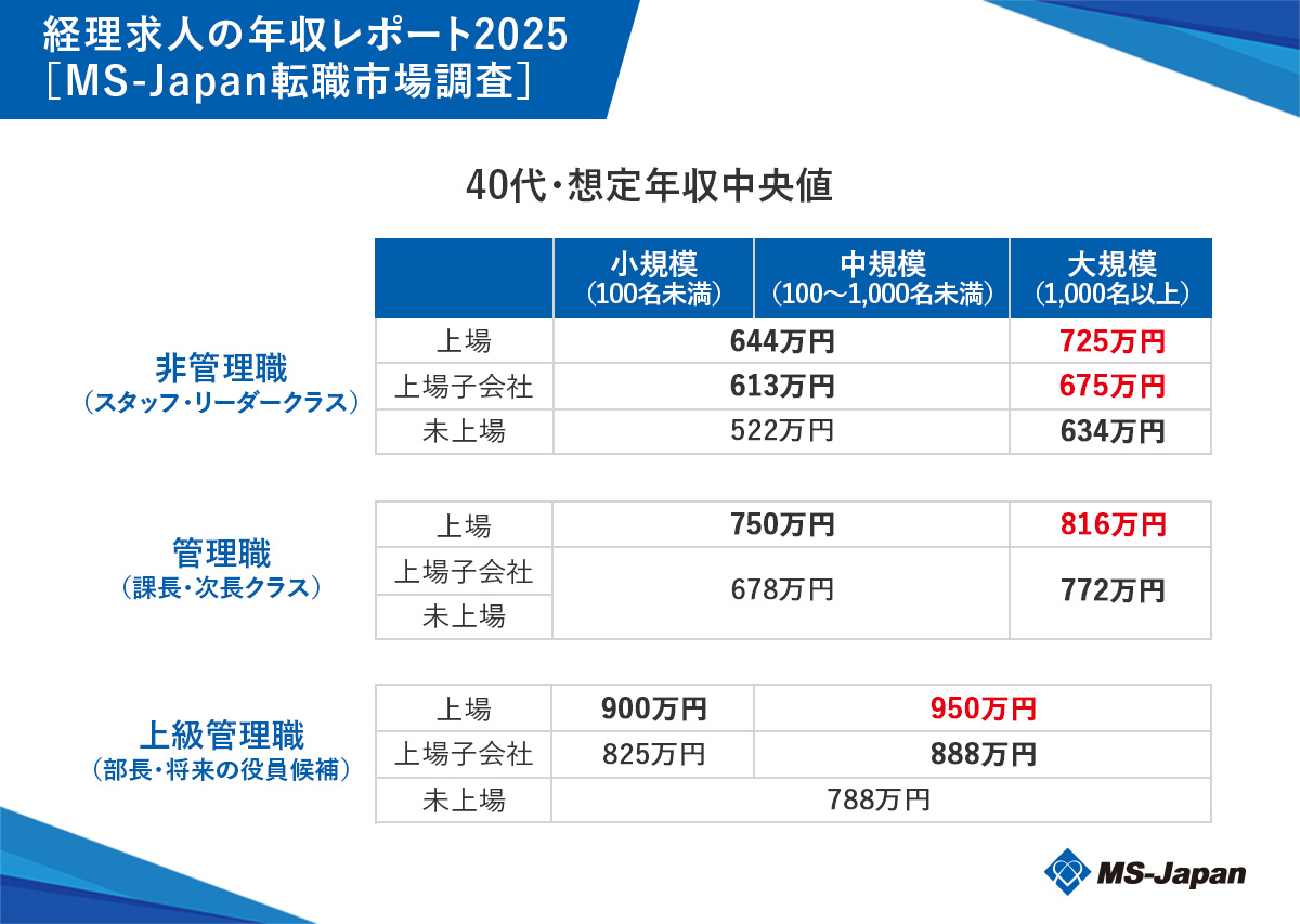 ・40代・中間管理職求人では、中小規模の未上場企業(上場子会社を含む)で678万円、大規模の上場企業で816万円