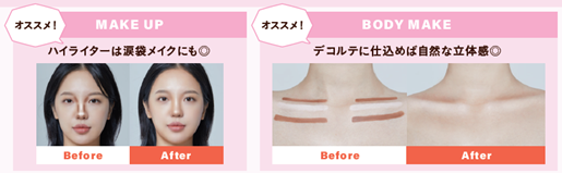 陰影をつけたい部分に仕込むシェーディング、光を集めたい部分に仕込むハイライターを活用すれば、1 本でなりたい自分に近づくメイクが可能です。