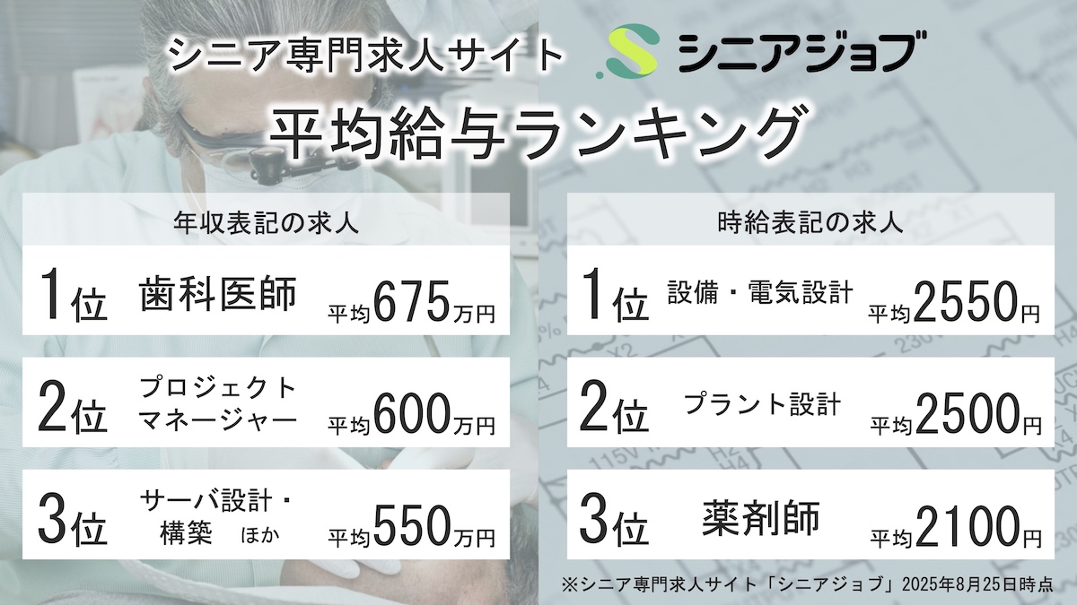 シニア転職支援の株式会社シニアジョブ(本社:東京都新宿区/代表取締役 中島康恵)は、運営するシニア専門求人サイト「シニアジョブ」に掲載された求人において提示されている給与の平均を職種ごとにまとめ、平均年収、平均日給、平均時給ごとにトップ10までのランキングを発表しました。平均年収がもっとも高く提示されていたのは歯科医師の675万円で、同率9位の土木施工管理、パッケージソフト・ミドルウェア開発、造園施工管理は512万円でした。平均時給がもっとも高く提示されていたのは設備・電気設計の2550円で、10位のコンビニ・スーパースタッフは1475円でした。