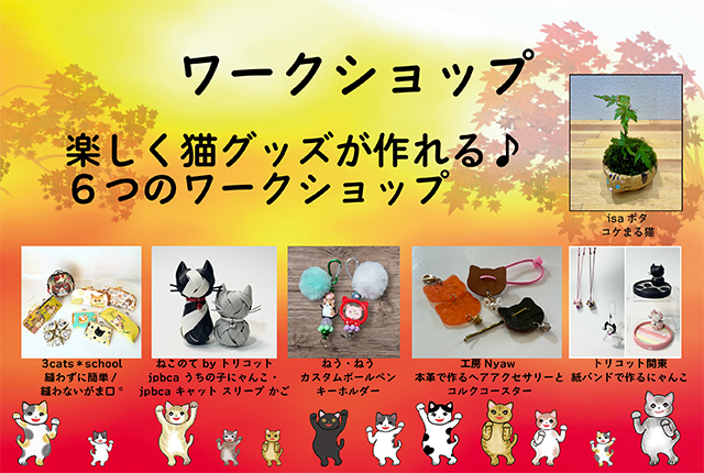 世界で一つのオリジナル作品が作れるワークショップ。にゃんだらけ19では6つのワークショップコーナーで、ヘアアクセサリーやがま口、カスタムボールペン、陶器のコケまる猫、猫のかご等、さまざまなグッズを手作りできます。制作時間は10分でできる手軽なものから、80分くらいかかる大作まで、いろいろ。ぜひ、にゃんだらけ19来場記念に素敵なオリジナル作品を作ってください。