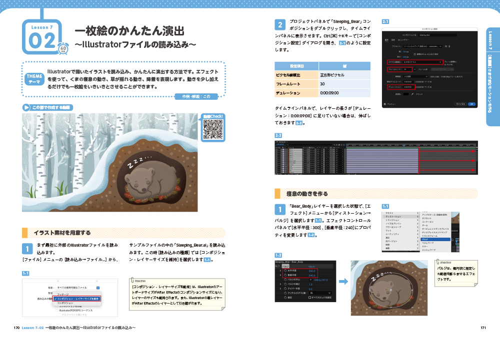本書は基礎編と発展編の2部構成になっており、基礎編では1つのモーショングラフィックス作品を制作する過程を通じて、After Effectsの基本操作と知識を体系的に学びます。解説と連動した動画も用意されているので、つまずきやすいポイントもしっかりサポートされています。