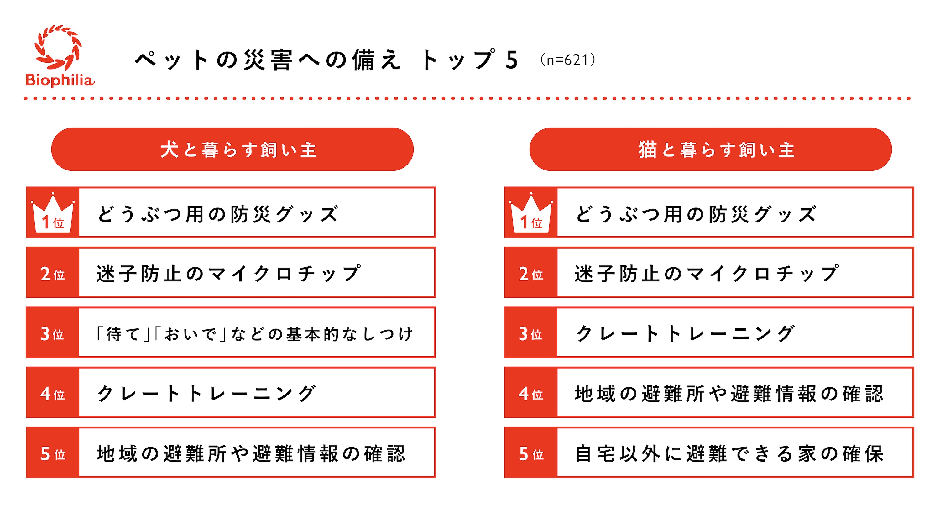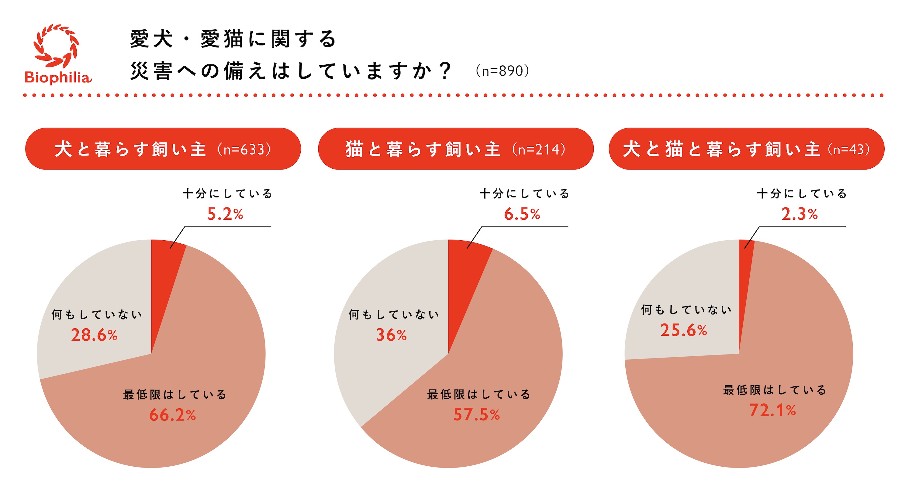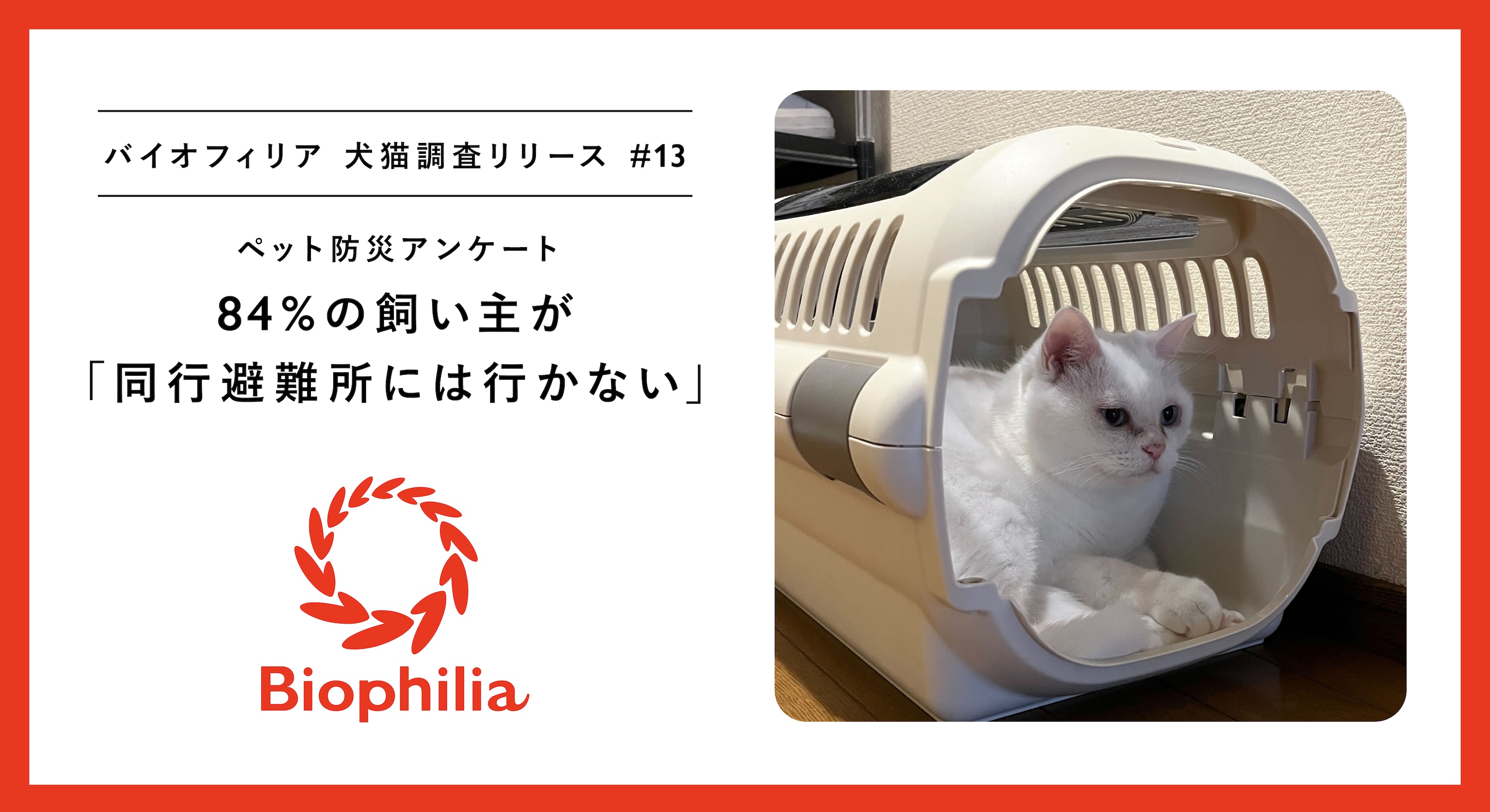 「すべてのどうぶつのいのちの尊厳が守られる新しい歴史をつくる」をミッションに、多くの会員さまとその大切なワンちゃん・ネコちゃんのいのちを守る企業として、防災に関する飼い主さまの現状や意向、同行避難に関する課題点を発信することで、少しでも人とペットの災害対策が前進することを目的とし、【バイオフィリア犬猫調査リリース#13】を発表しました。