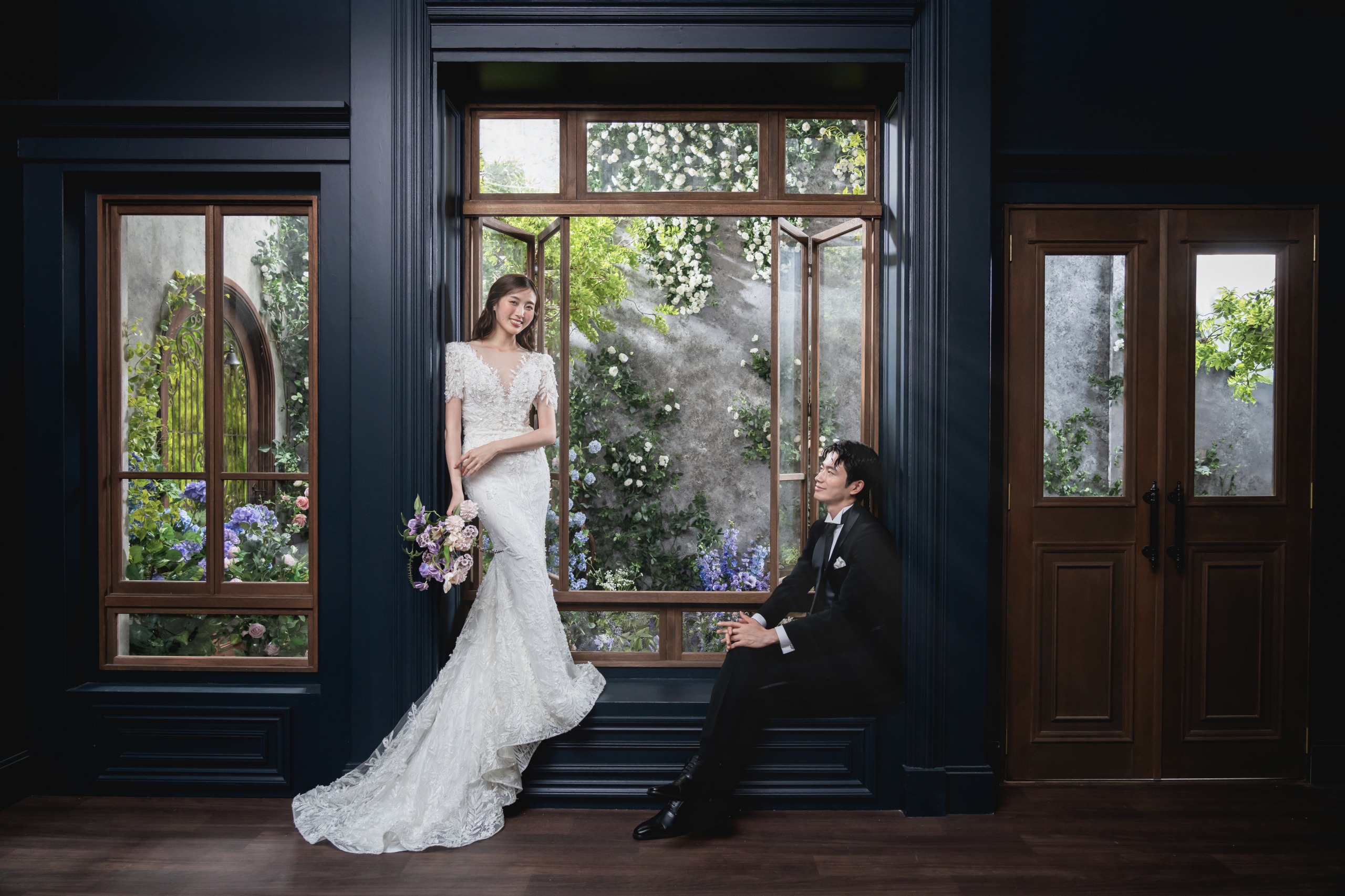 シックなネイビー調の室内と、窓の外に広がる華やかな花々のコントラストが大人可愛い空間を演出します。