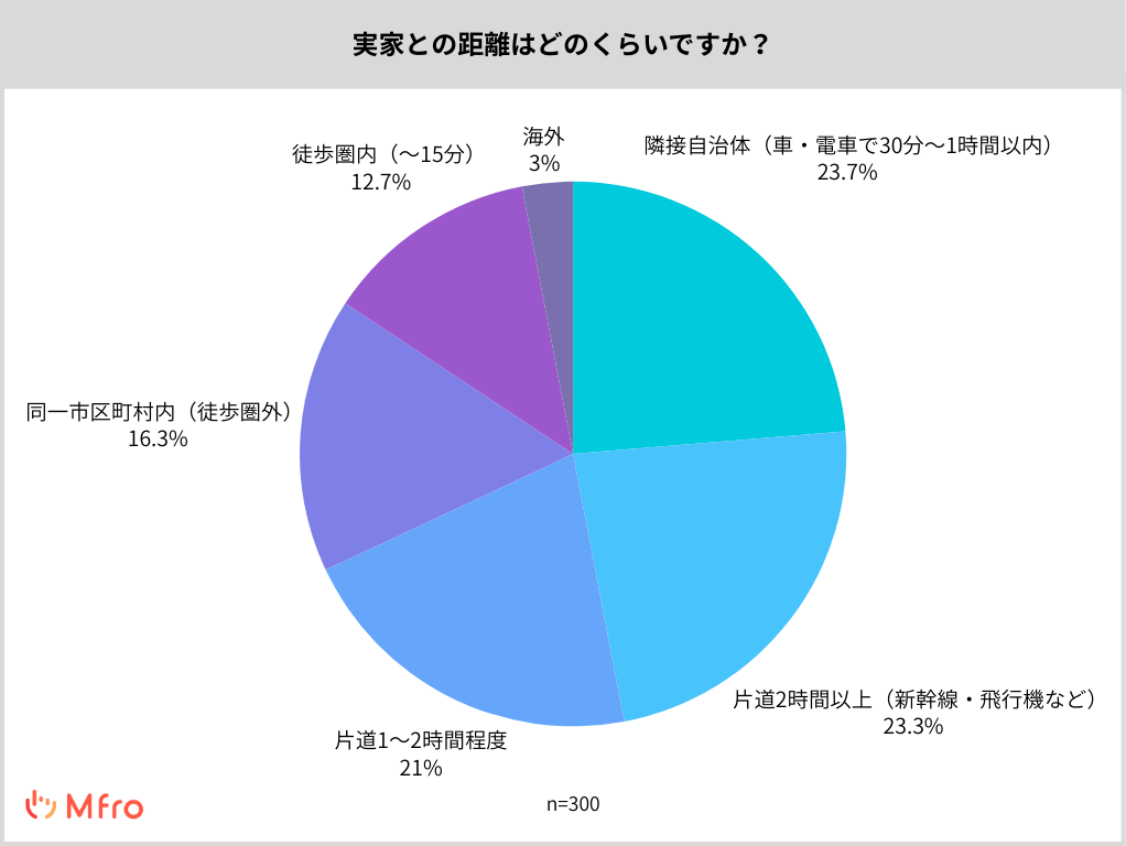 次いで「片道1〜2時間程度」(21%)や「同一市区町村内」(16%)が続き、徒歩圏内に実家がある人は約13%にとどまりました。