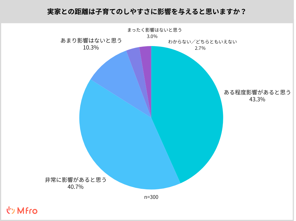 そこで今回、株式会社エムフロ(https://www.mfro.net/)が運営するクラウディアアシスタント(https://craudia-assistant.com/)は、子育て中のパパ・ママ300人を対象に「実家との距離感が暮らしに与える影響」に関するアンケートを実施しました。