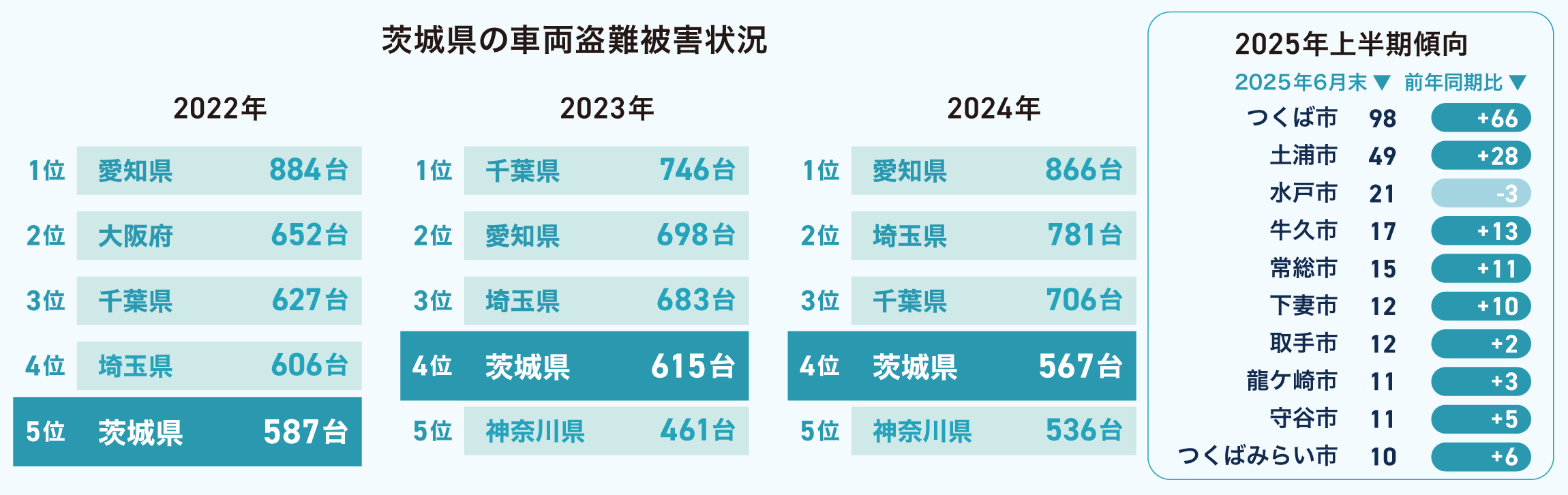 近年、キーエミュレーター(通称:ゲームボーイ)やCANインベーダーといった電子的な盗難手口が巧妙化。茨城県は毎年、自動車盗難認知件数が全国ワースト5で、2025年上半期も増加傾向が続いており、茨城県警も盗難対策を呼びかけています。