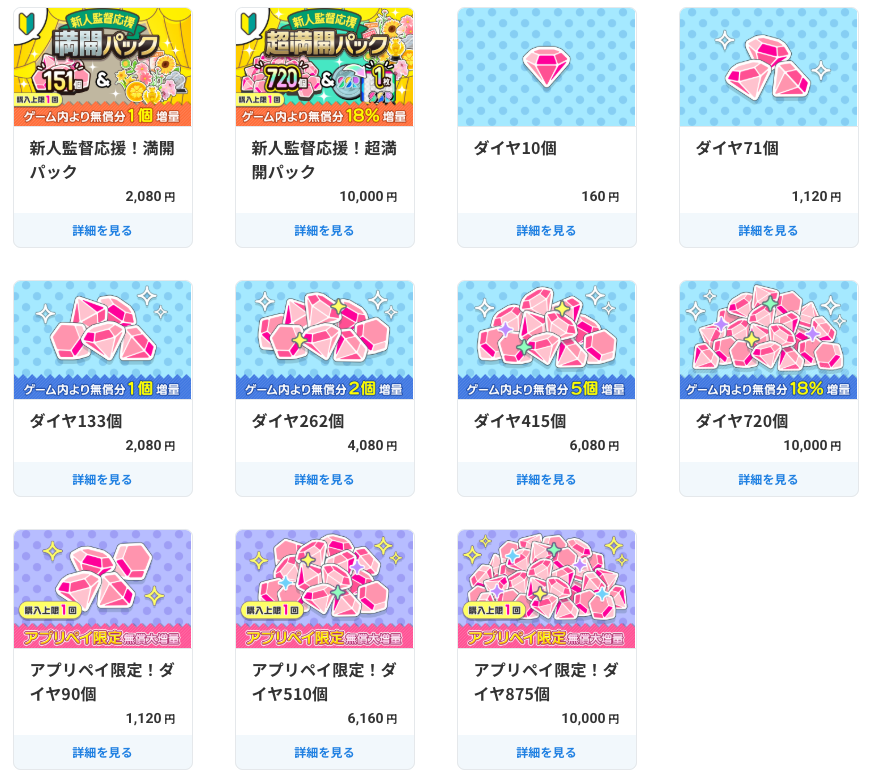 本ストアでは、ゲーム内で使用できる「ダイヤ」購入時に、ゲーム内での直接購入時よりも無償ダイヤ数が増量されたアイテムを販売いたします。お得かつ安全にゲーム内アイテムが購入できる公式アプリペイストアをぜひご利用ください。