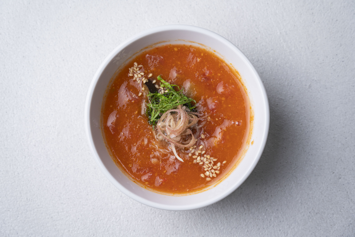使用食材:【スープ】昆布だし、トマト、【具 材】焼きなす、ミョウガ、シソ、煎りごま含