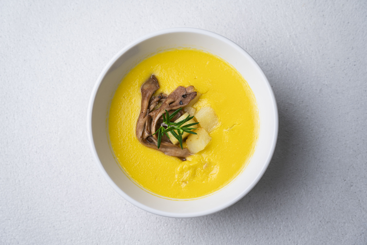 使用食材:【スープ】昆布だし、トウモロコシ、【具 材】じゃがいも、舞茸、黒胡椒、バルサミコ酢、フェンネル含