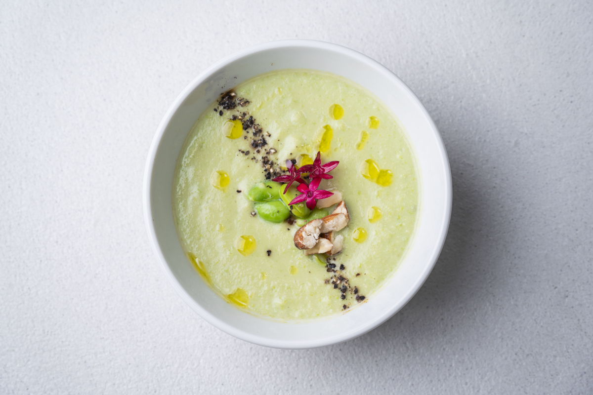 使用食材:【スープ】ベジブロス、枝豆、【具 材】枝豆、エディブルフラワー、アーモンド、オリーブオイル、黒胡椒 含