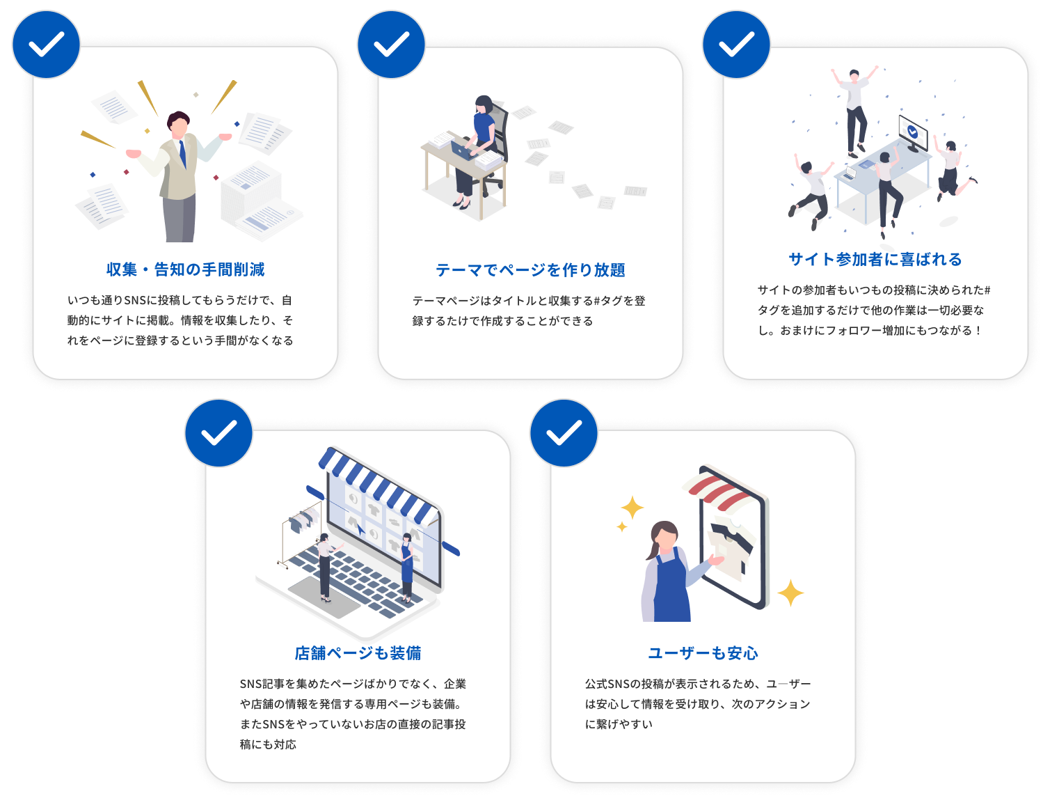 ・主な機能:SNS投稿の自動収集・整理、テーマ別ページ生成、専用店舗ページ機能