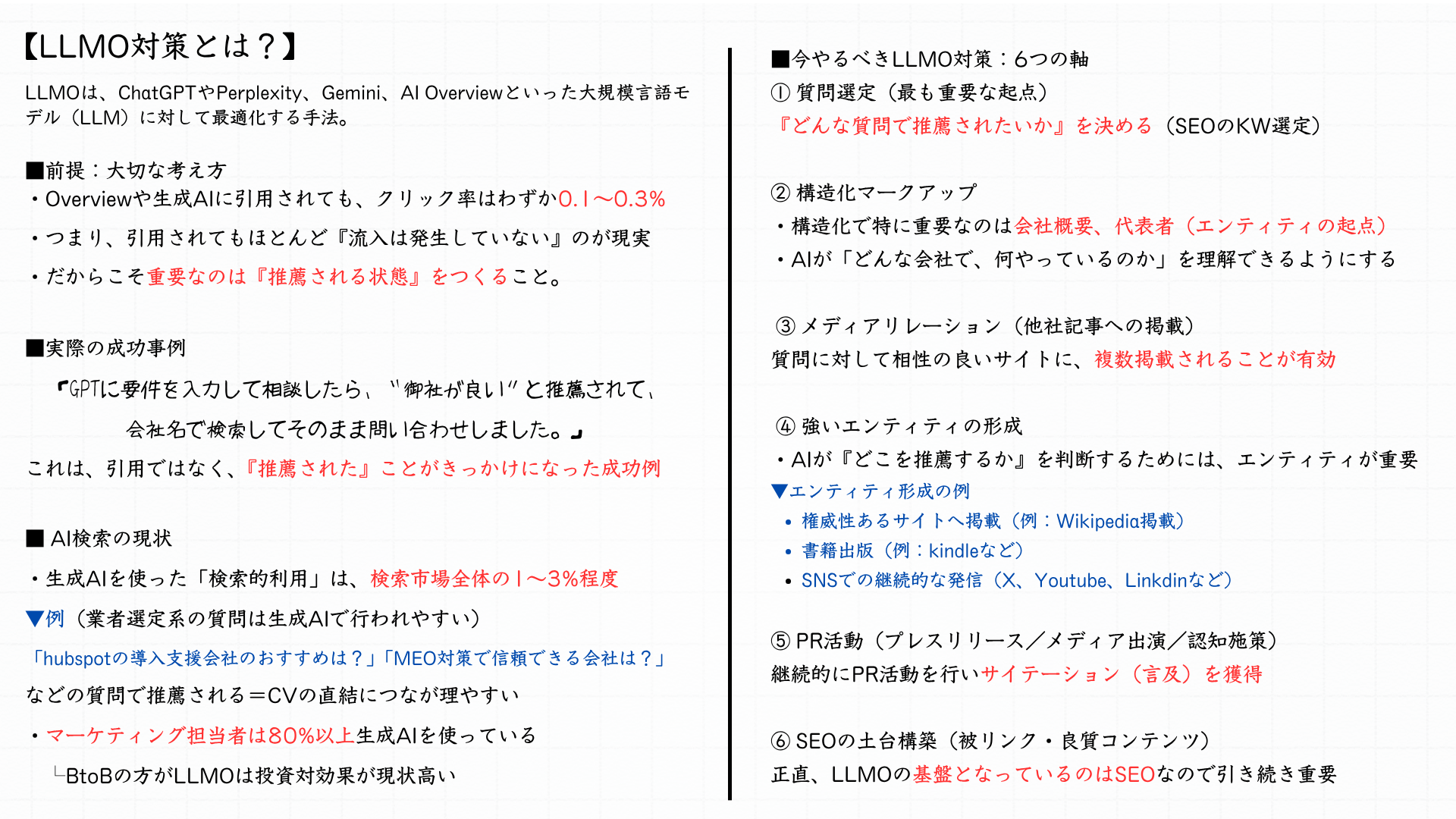 LLMOは単なるSEOの延長ではなく「どんな質問にどう推薦されるか?」という情報設計や裏側のロジックの研究がとても大事になります。