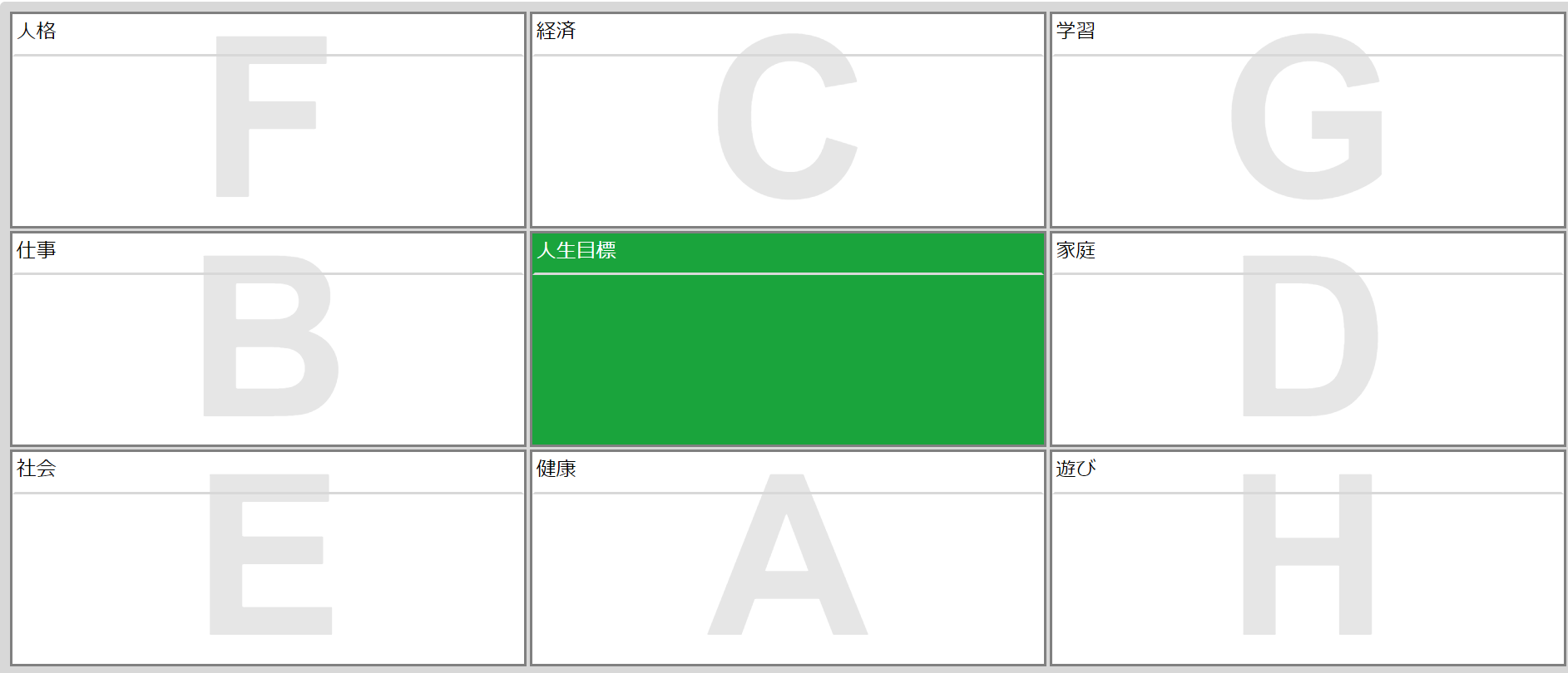 目標達成のためのフレームワーク「マンダラチャート」を元に、考案したクローバ経営研究所と共同で開発したヒューマングループのSELFingツール。縦横3マスずつ、合計9マスが描かれてあり、中心に達成したい目標を書き、その周囲の8マスに目標を達成するために必要な要素を書き込みます。