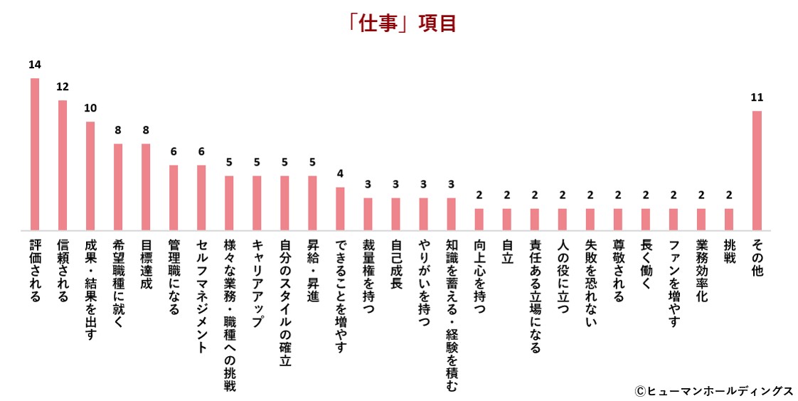「人生目標」を達成するために必要な8大分野の一項目である「仕事」に関する目標では、【評価される】系目標(14名)が最多で、具体的に、社内の年間表彰である新人賞や優秀社員賞の受賞を目標に掲げる人が多く、努力の結果や成果を形にすることを意識している様子が垣間見れます。