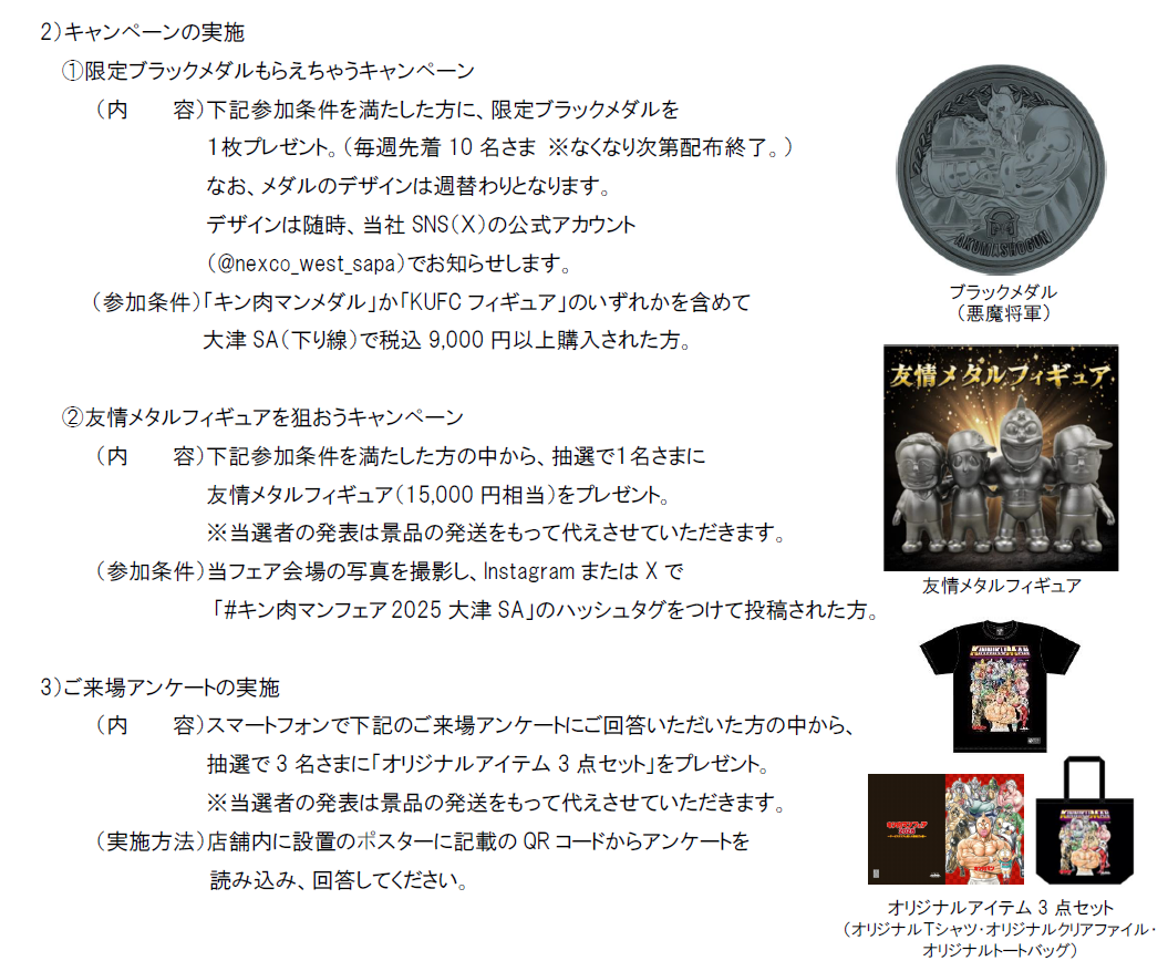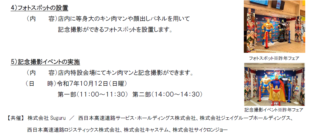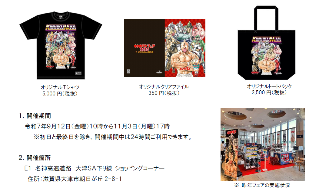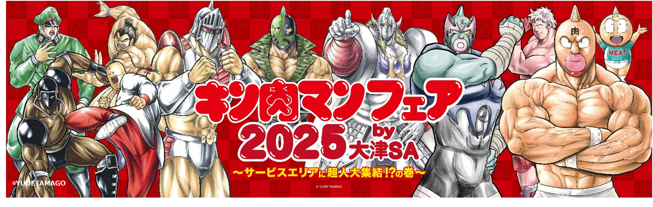 西日本高速道路サービス・ホールディングス株式会社関西支社(大阪府吹田市、支社長:佐田(さた)恵(めぐみ))は、令和7年9月12日(金曜)から11月3日(月曜)まで、E1 名神高速道路 大津サービスエリア(SA)下り線(大阪方面)にて「キン肉マンフェア2025~サービスエリアに超人大集結!?の巻~」を開催いたします。