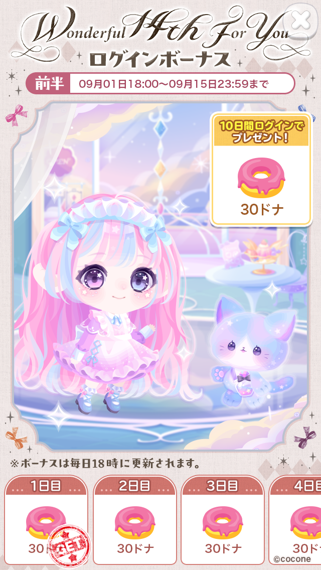 14周年を記念した特別なログインボーナスでは、ドナ(アプリ内通貨)やガチャ券などが手に入るほか、各期間ごとに計10日間ずつログインすることで「14th Purely Festival」で手に入るイベントアイテムと組み合わせて使える特別なアイテムが登場します。