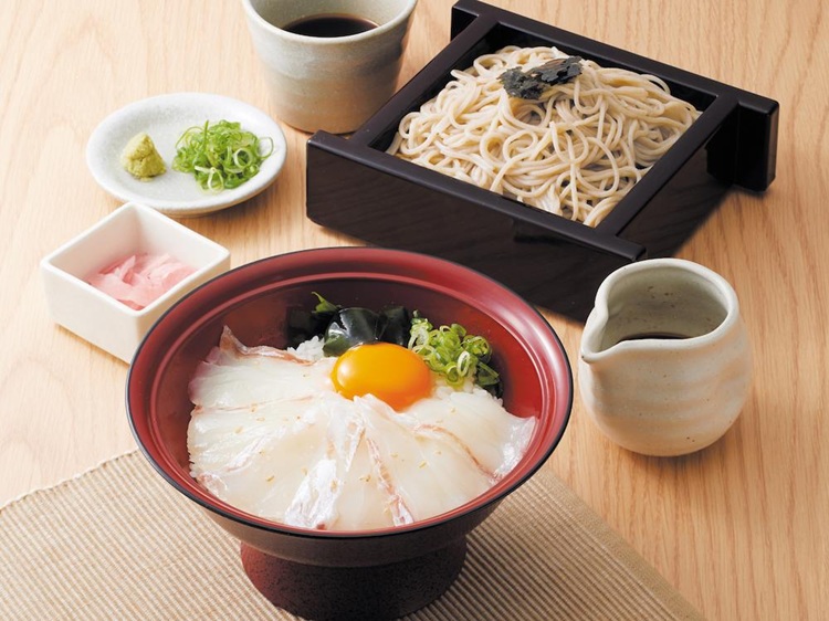 高知県産の真鯛は程よい甘みが特徴で鯛めし用のタレと玉子を混ぜておめしあがりください。セットの麺はそば又はうどん(温・冷)をお選びいただけます。