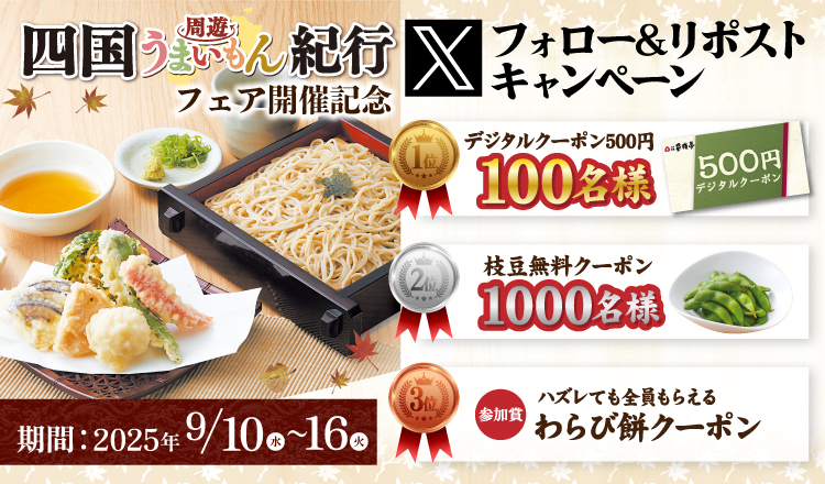 「四国周遊うまいもん紀行」開催を記念して抽選でデジタルクーポン500円引きが当たるXキャンペーンを9/10~実施