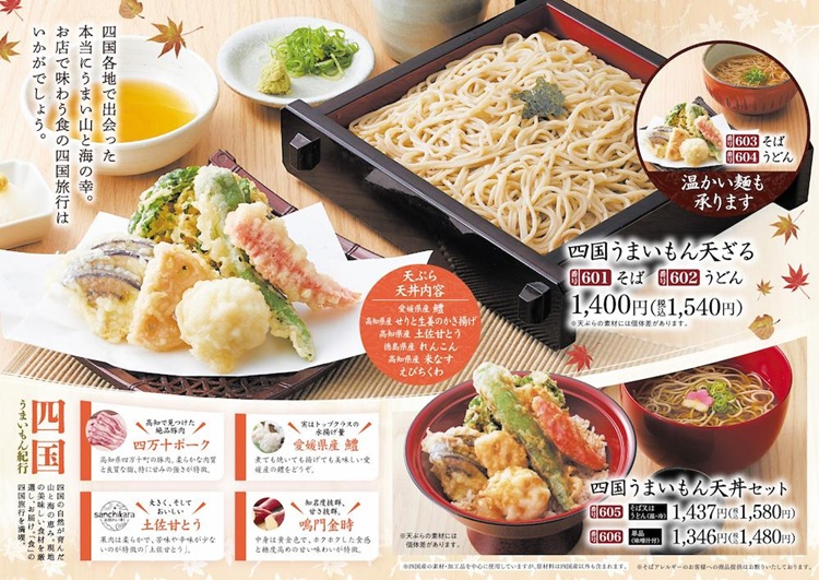 海と山の幸をぜいたくに味わえる天ぷらとおそばの「四国うまいもん天ざるそば」、ボリューム満点の「四国うまいもん天丼セット」は、毎年多くのお客様にご好評いただいている人気メニューです。