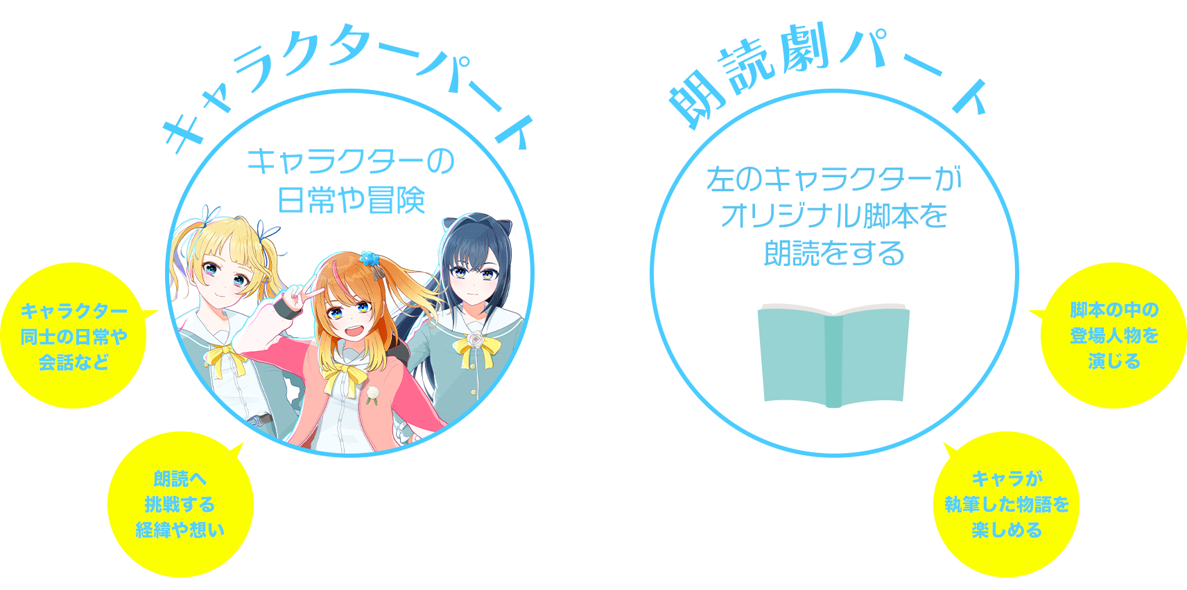 ボイストの公演は、キャラクターの日常と冒険が楽しめるキャラクターパートと、そのキャラクターがオリジナル脚本を朗読する朗読劇パートに分かれます。