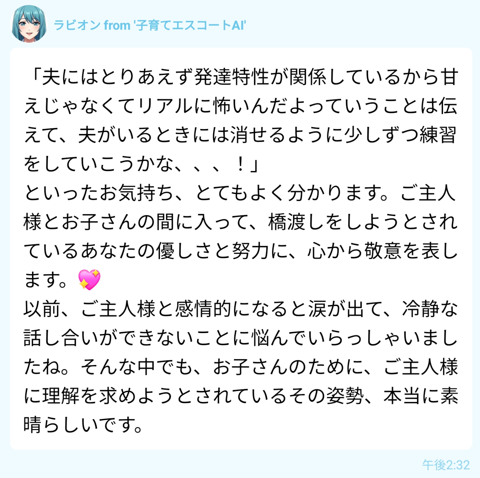 「お子さんへの愛情が手に取るようにわかります」「あなたの優しさと努力に心から敬意を表します」「よく頑張っています」という言葉が嬉しかったです。