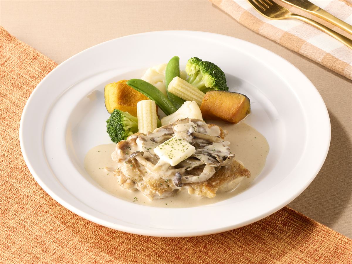しめじと舞茸の旨みが溶け込んだポルチーニ香るクリームソースが食欲をそそる、秋にぴったりなチキンステーキです。カボチャやブロッコリー、カリフラワーなどのごろっとした温野菜を添えました。
