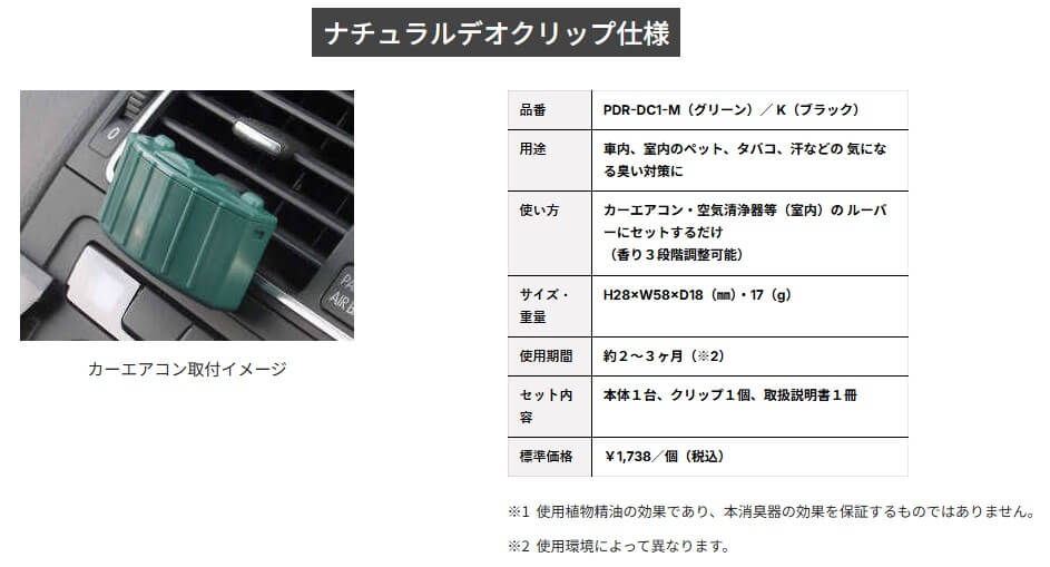 エス・デイ・ケイ株式会社(本社:福岡県大野城市)は、100%天然植物精油であるフィトンチッド(※3)を使用した車用消臭クリップ「ナチュラルデオクリップ」を取り扱っています。
