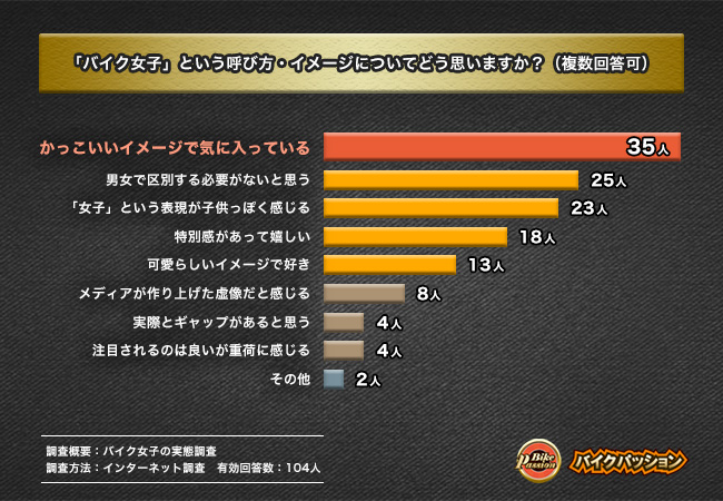 「『バイク女子』という呼び方・イメージについてどう思いますか?」との質問では、『かっこいいイメージで気に入っている』(35人)が最多となりました。「バイク女子」と言われることに対し、多くの女性は好意的に受け止めているようです。